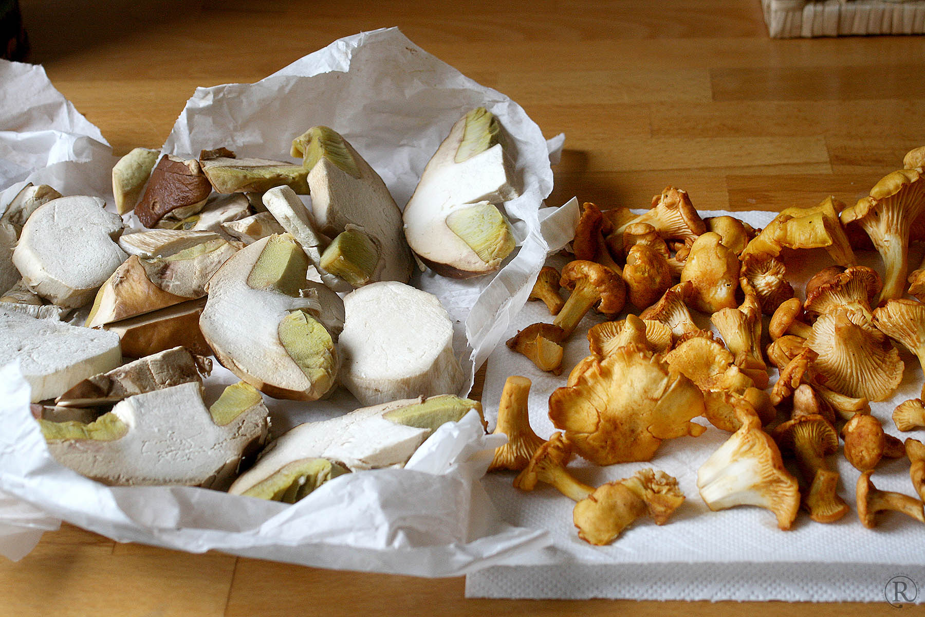 - Pilze putzen, große Pfifferlinge halbieren, Steinpilze in grobe Würfel schneiden