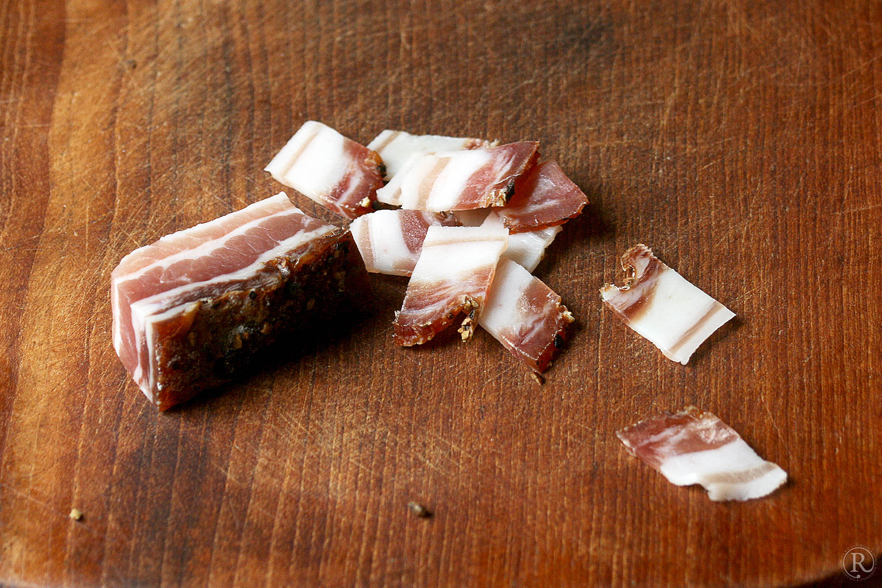 - Währenddessen den Speck ohne Fett kross braten, die Zwiebeln dazu geben und glasig werden lassen. Zum Schluß den Knoblauch dazu.