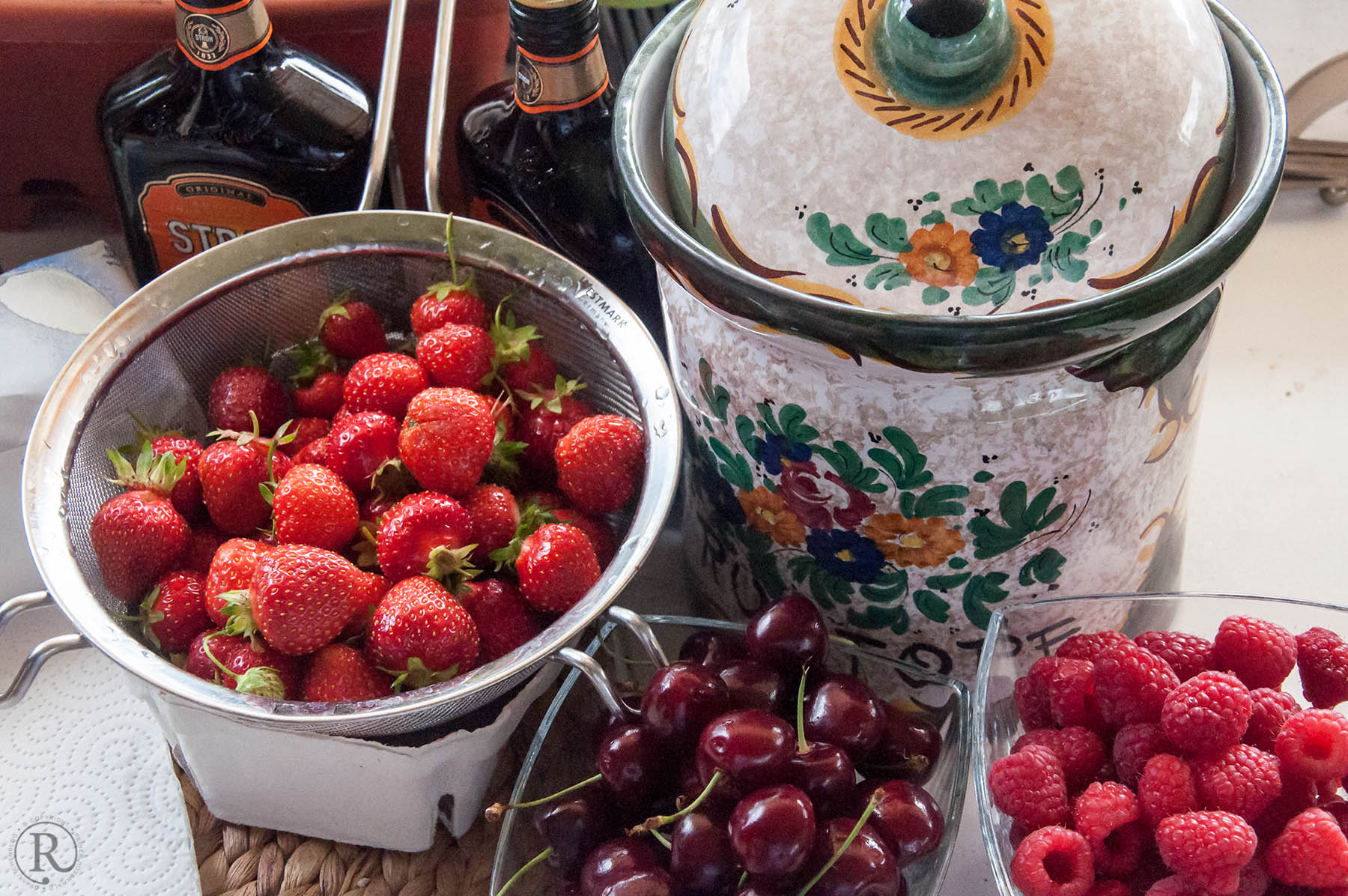 Glas oder Metall ist suboptimal, besser ist Steingut oder Porzellan - je 500 g erntefrische Früchte, Erdbeeren, Himbeeren, Kirschen, Brombeeren. Später im Jahr dann Mirabellen, Pflaumen, Birnen, was das Herz begehrt