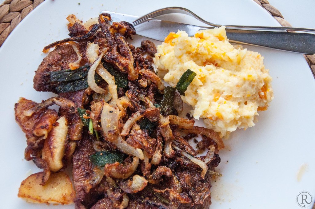Mit gebräunten Zwiebeln, gebratenem Apfel und einem Kartoffelstampf mit Karotten und Sellerie — mmmh! Wie bei Muttern!