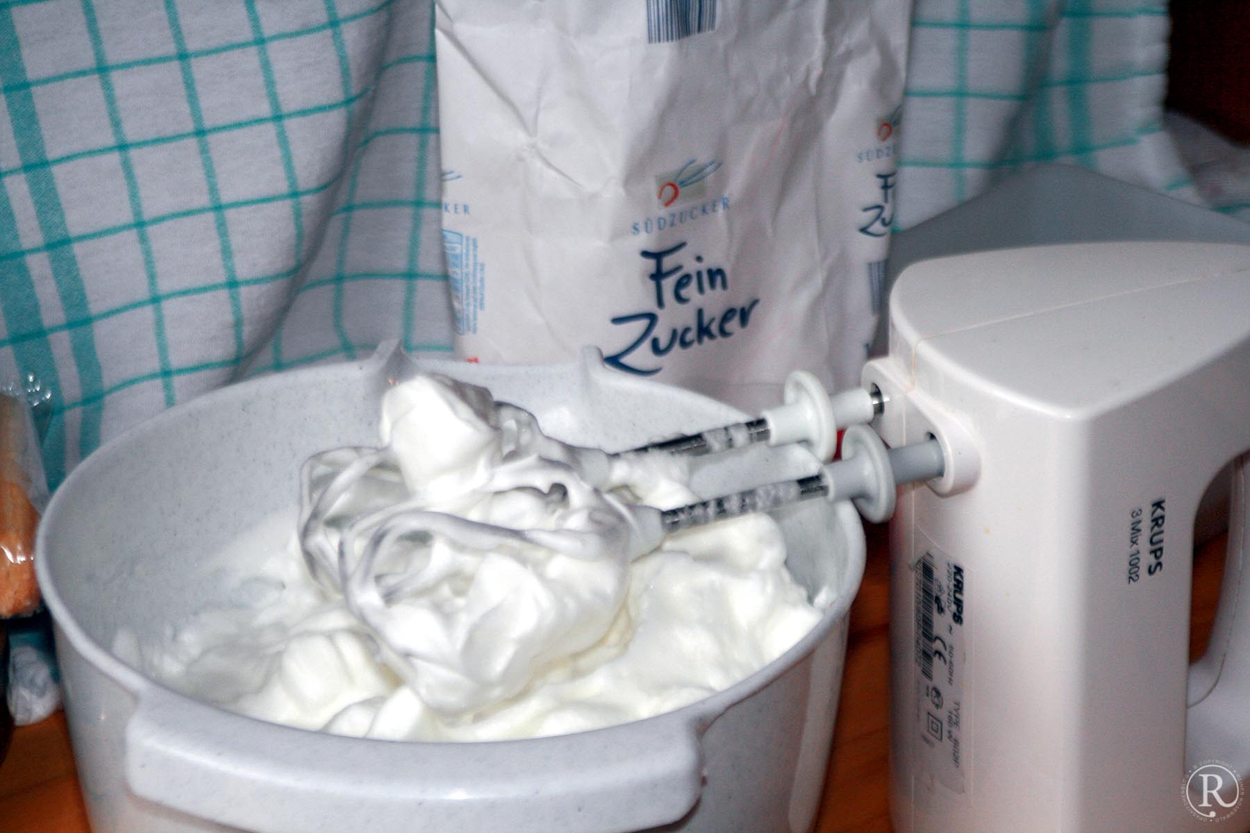 (wenn der Topf umgedreht wird, darf der Schnee nicht herausrutschen oder fallen). - Den Schnee vorsichtig unterheben, das eine luftige Masse entsteht.