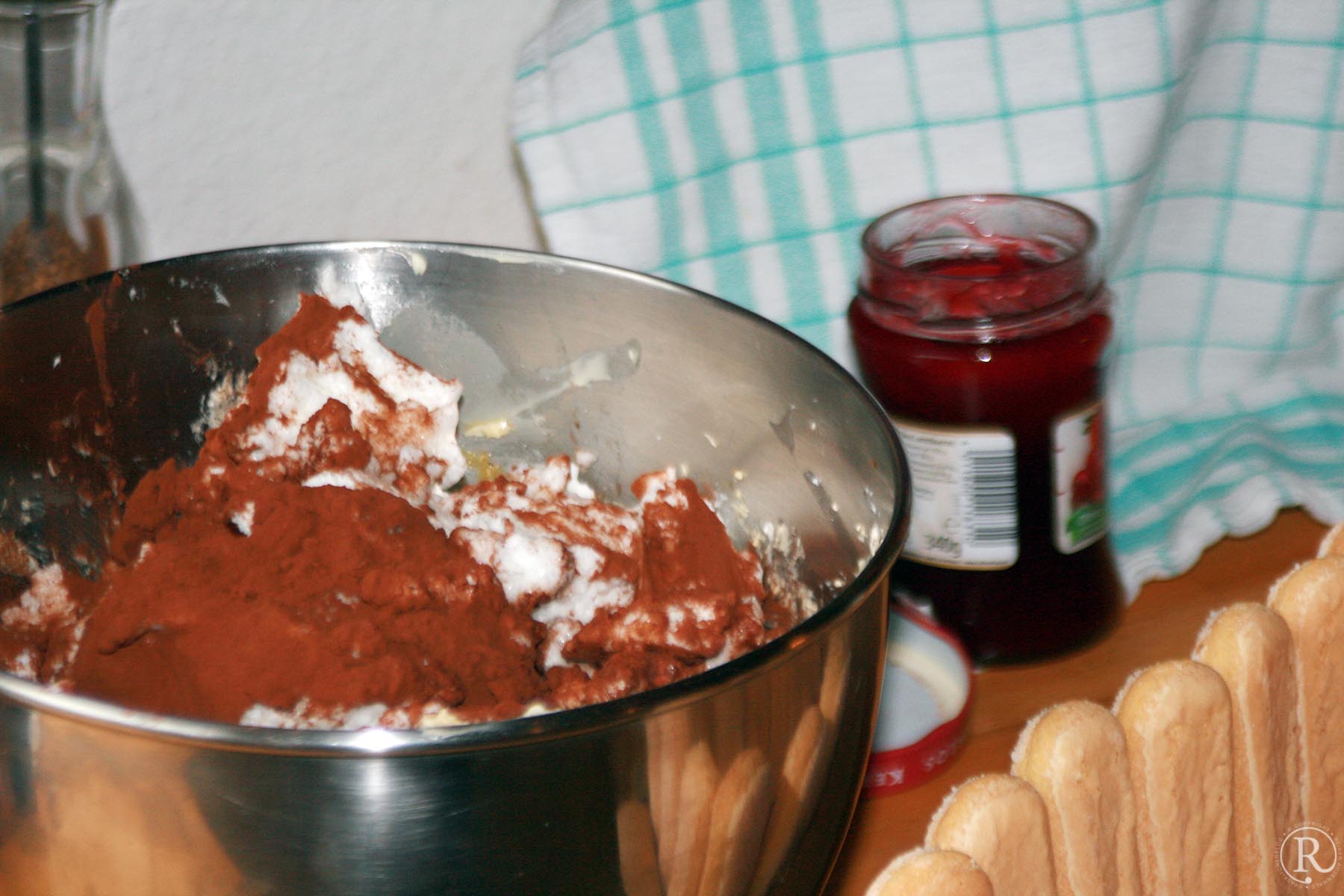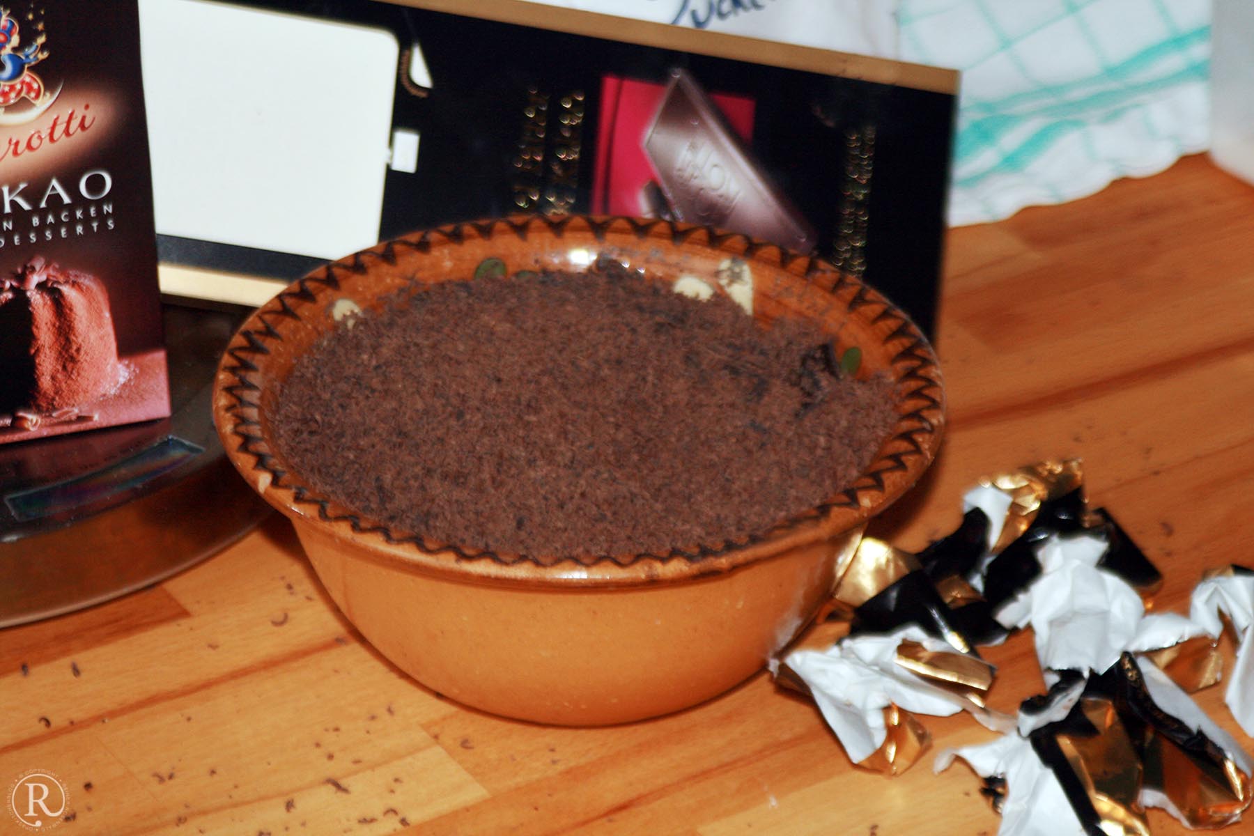 - Die fein geriebene Schokolade dazu einrühren. Den Kakao ganz zum Schluss einrühren.