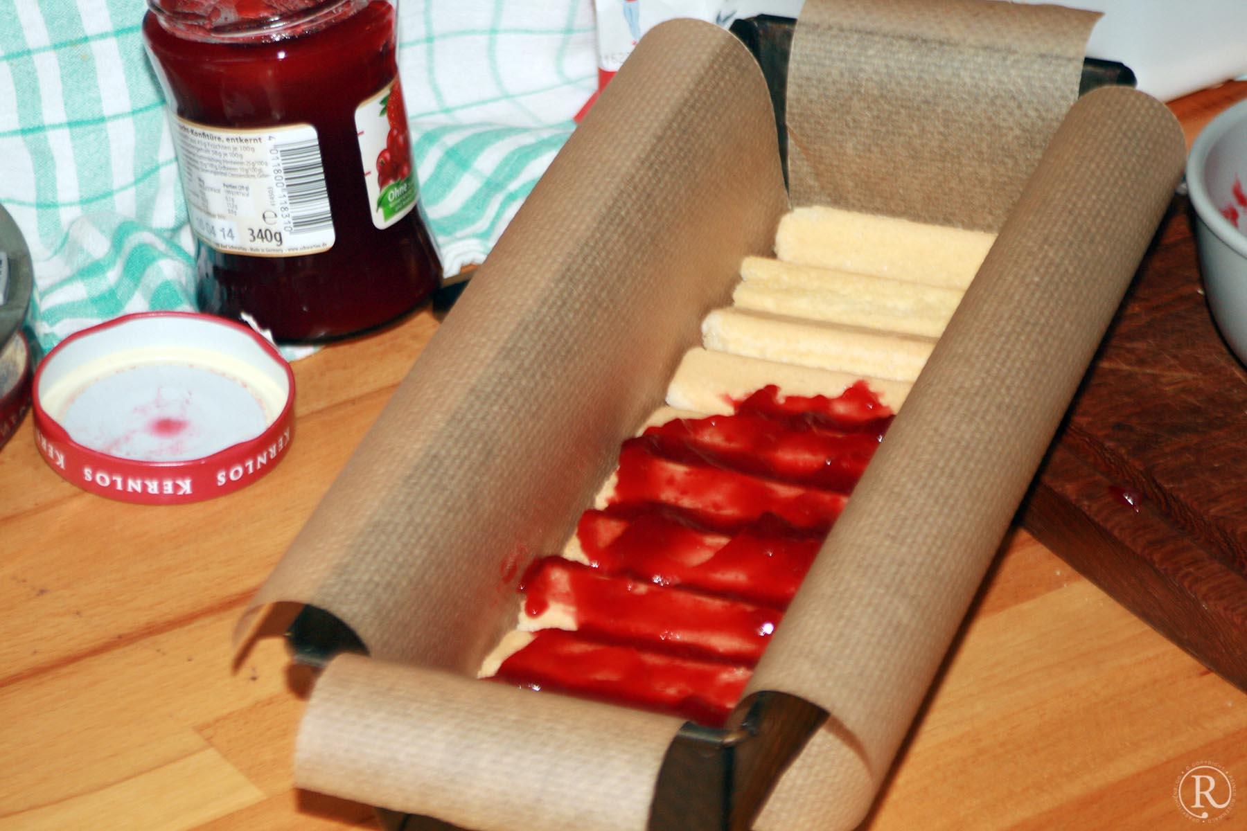 Dann nehme ich zum Bestreichen des Biskuits Sauerkirsch-Marmelade oder Orangen-Gelee. Beides passt wunderbar zu diesem sehr schokoladigen Dessert.