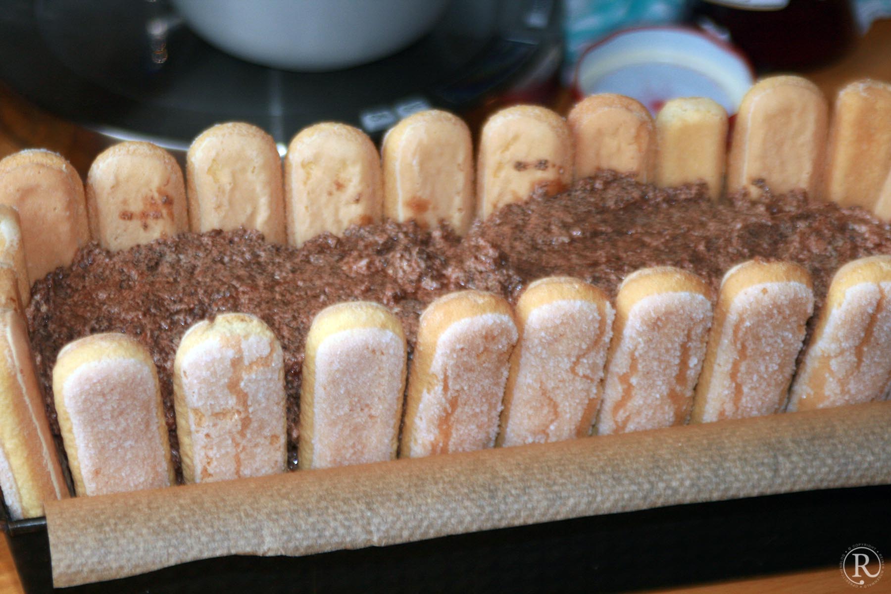 Die Version hat nochmal mehr Pepp! - Die Masse einfüllen, mit den restlichen Biskuits abdecken. Evt. überstehende Biskuits abschneiden (Zipfel naschen 😋 ). Oberfläche sollte möglichst glatt sein, sonst hat man später ein Problem beim Stürzen.