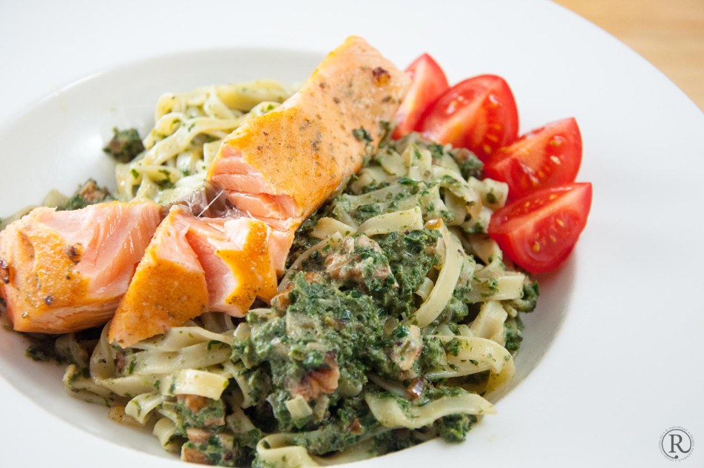 Nudeln machen sowieso glücklich, Spinat ist gesund, Lachs und Walnüsse heben den Geschmack.