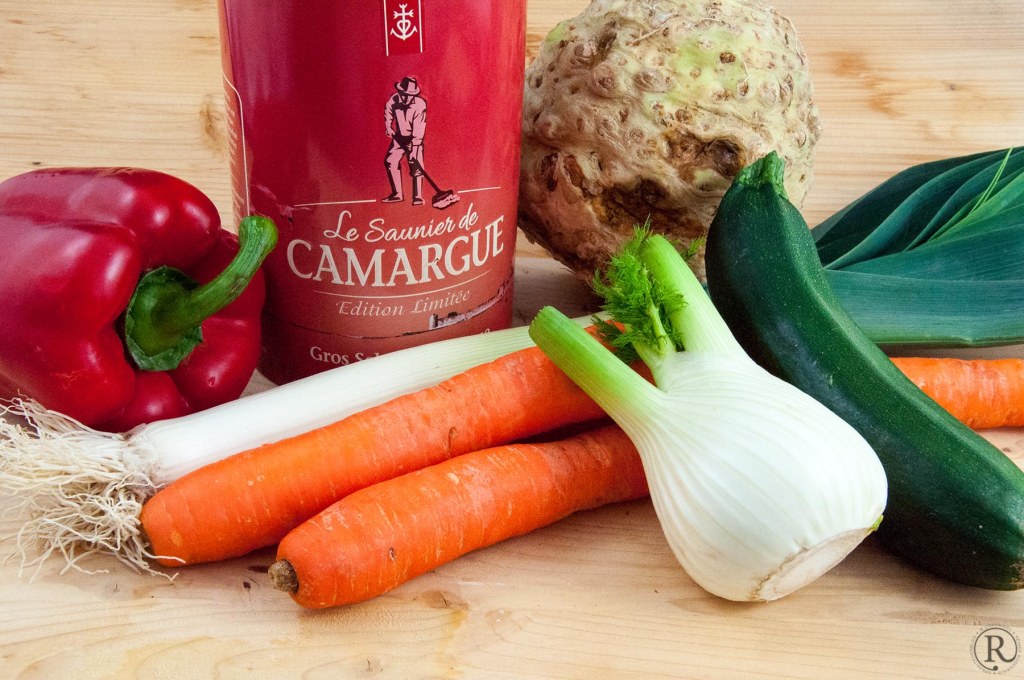 (200 g Karotten, 1 Petersilienwurz, 2 Pastinaken, 1 halbe Knolle Sellerie, 1 oder 2 Stangen Lauch, 1 große rote Paprika, 1 Fenchelknolle, 3 bis 4 Zehen Knoblauch, 3 mittelgroße Zwiebeln, 1 frische Pepperoni, 1 Bund Petersilie, 1 Bund Basilikum, ein paar Zweige Thymian, etwas Liebstöckel und Majoran – wenn es geht frisch. Aber getrocknet geht genauso gut, dann halt nicht so viel.)