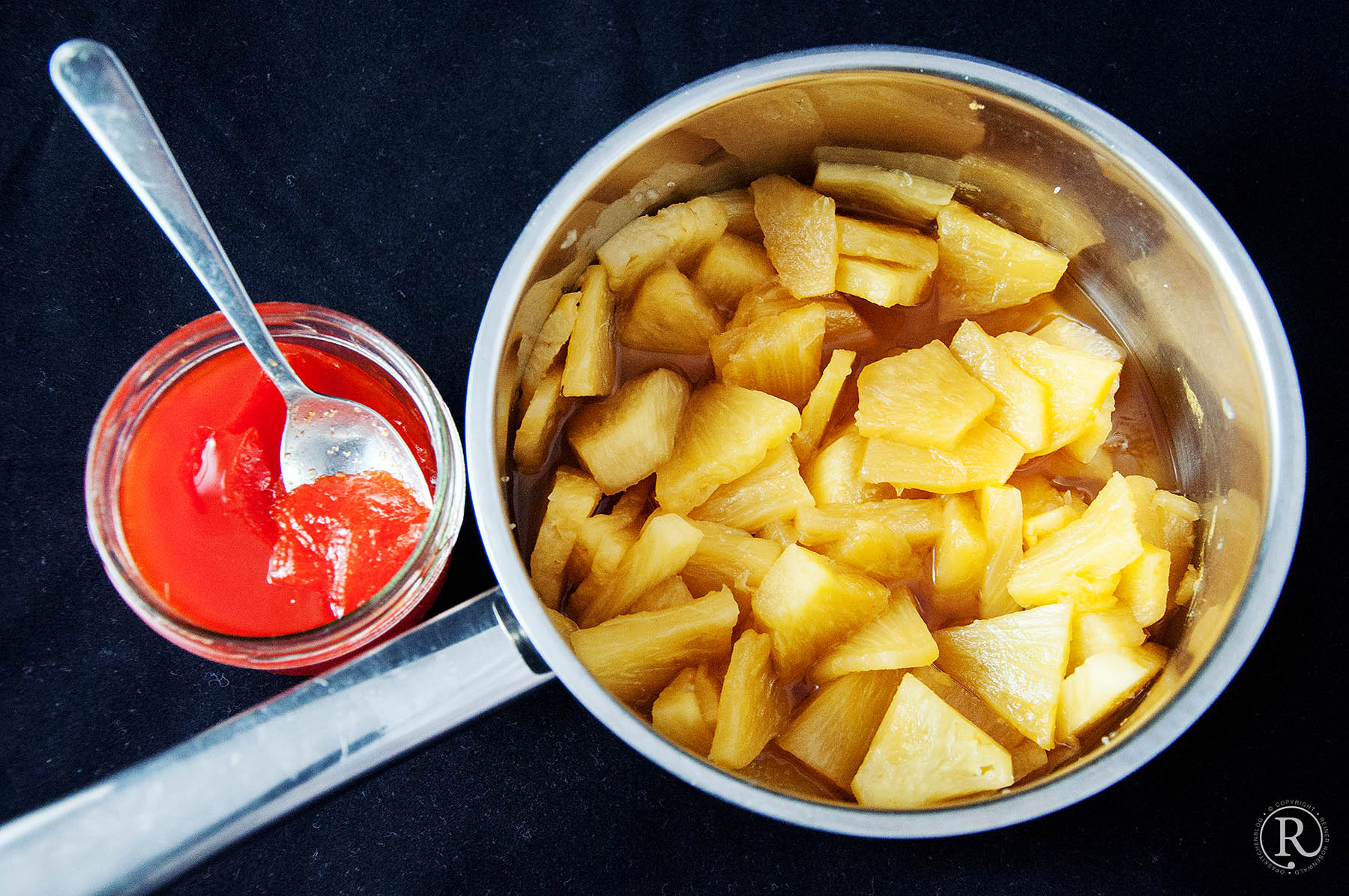 - Die gestückelte Ananas in den Topf und bei mittlerer Hitze ein paar Minuten dünsten. Die Ananas-Stücke werden glasig. Vom Herd nehmen.