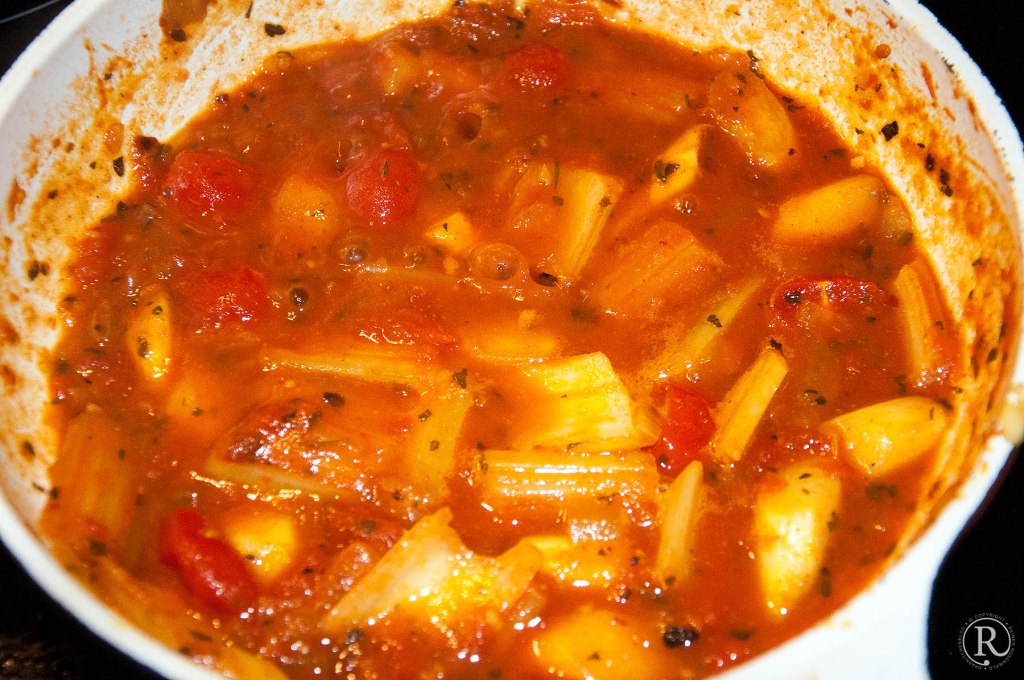 Ist er flüssig, die Schalotten und den Knoblauch hineingeben. Glasig werden lassen. - Die Tomaten dazu und gut anbraten – so dass die Flüssigkeit stark reduziert wird. Dann die Stücke vom Stangensellerie und Spargel dazu, glasig werden lassen.