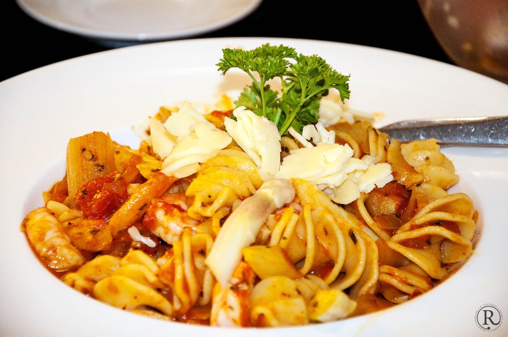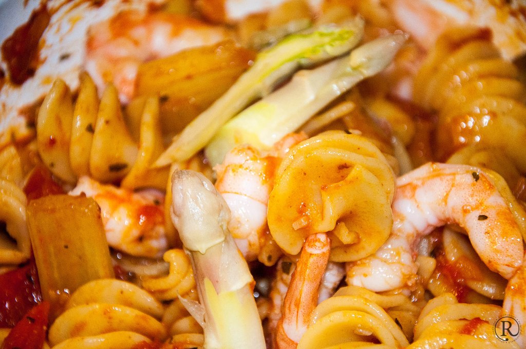 Abgießen. Etwas von dem Kochwasser auffangen. - Die King Prawn kommen etwa 3 Minuten vor dem Ende der Nudelkochzeit in die sehr heiße Sauce. Abschmecken.