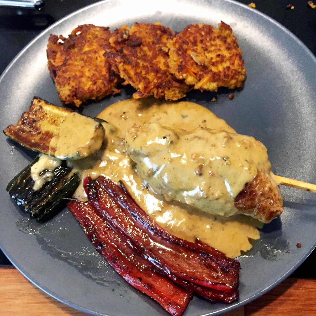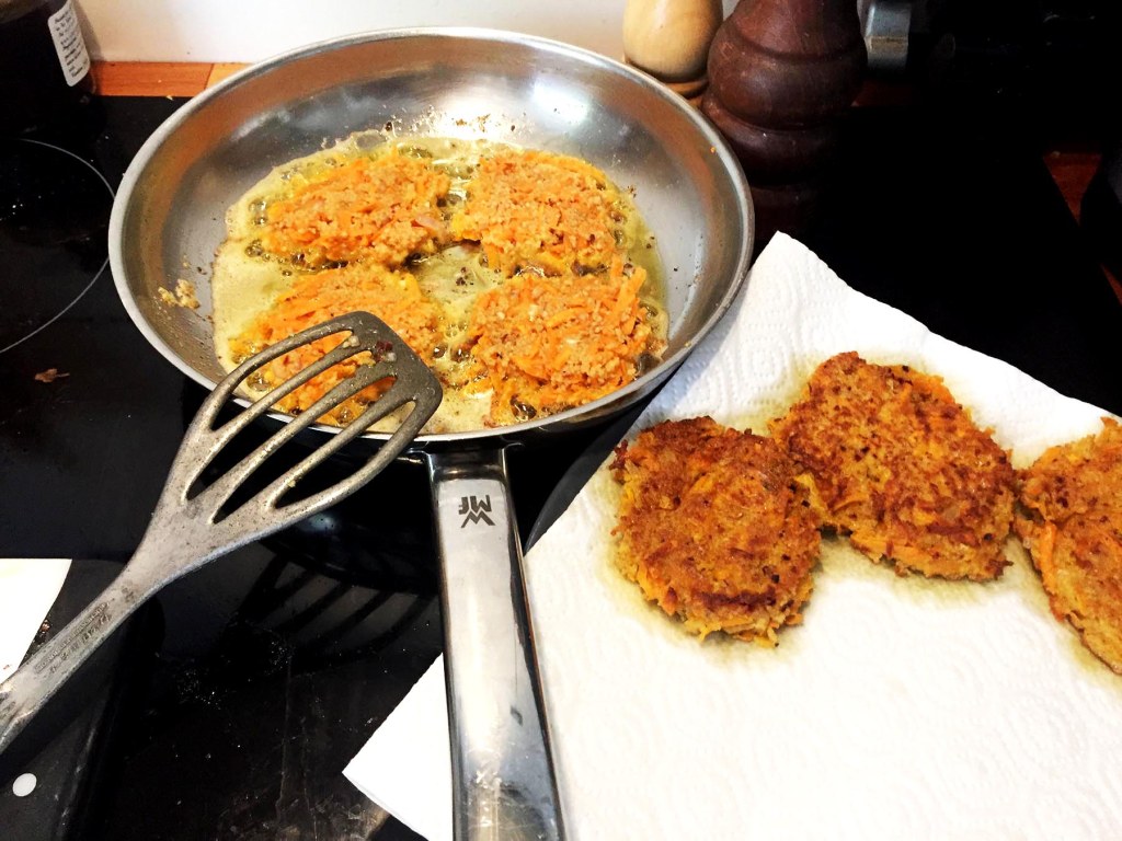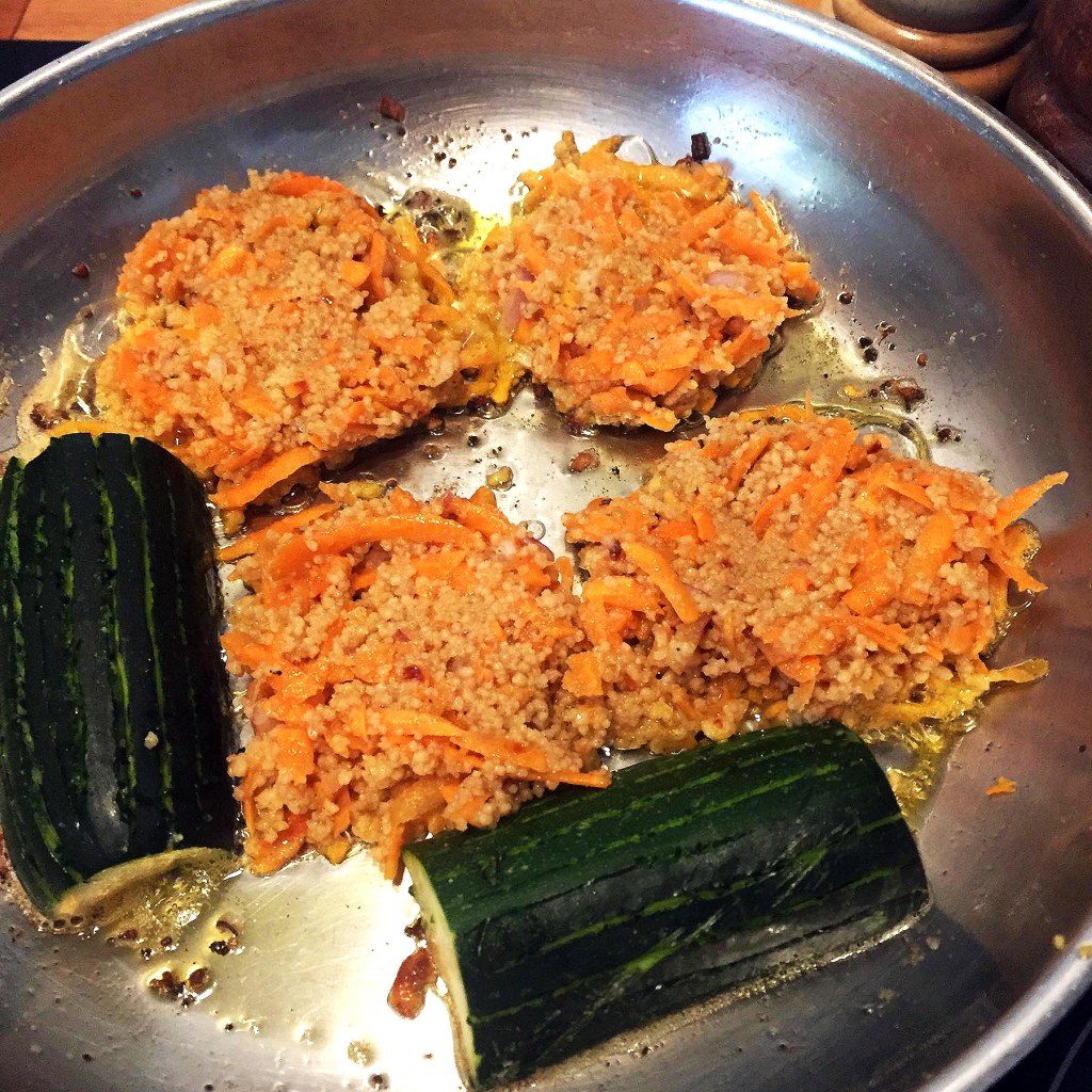 Sieht jetzt aus wie eine aufgespießte Taube (Vogerl?) - In einer großen Pfanne reichlich Ghee und etwas Olivenöl erhitzen. Mit zwei Suppenlöffeln vier Taler aus der Süsskartoffel-Couscous-Masse stechen. Drei bis vier Minuten von einer Seite braten, wenden sobald die Masse genügend gestockt ist und nochmal drei bis vier Minuten goldbraun fertig braten.