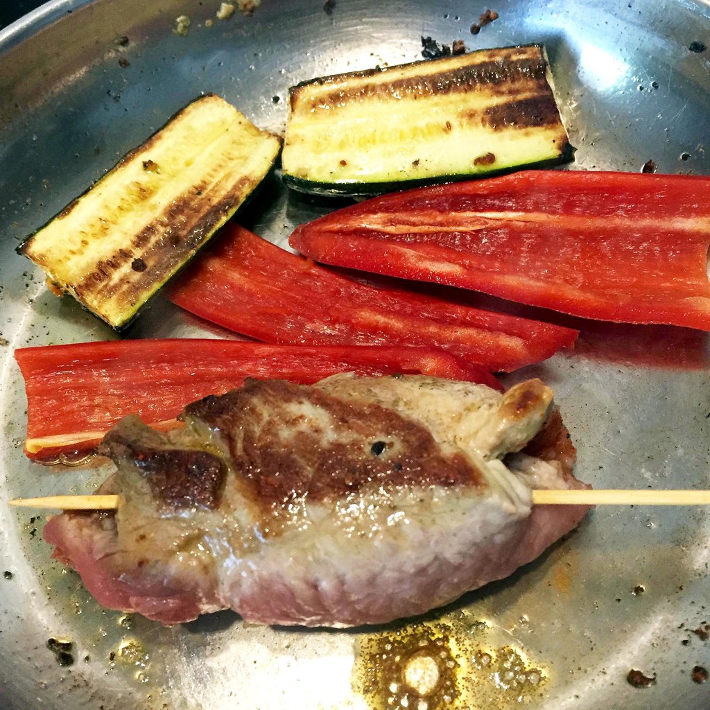 Aufpassen, dass das Fett nicht zu heiß wird! - In der gleichen Pfanne den Kalbsvogel von allen Seiten anbraten. Die halbierte Zucchini dazu und ebenfalls den Spitzpaprika.