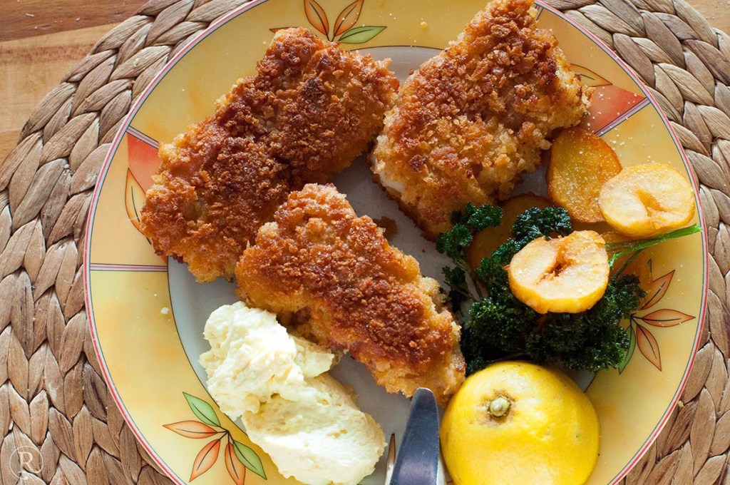 - leicht salzen, in dem aufgeschlagenen Ei und dann in den Semmelbröseln wälzen bis alles schön bedeckt ist. In Olivenöl von allen Seiten knusprig ausbacken.