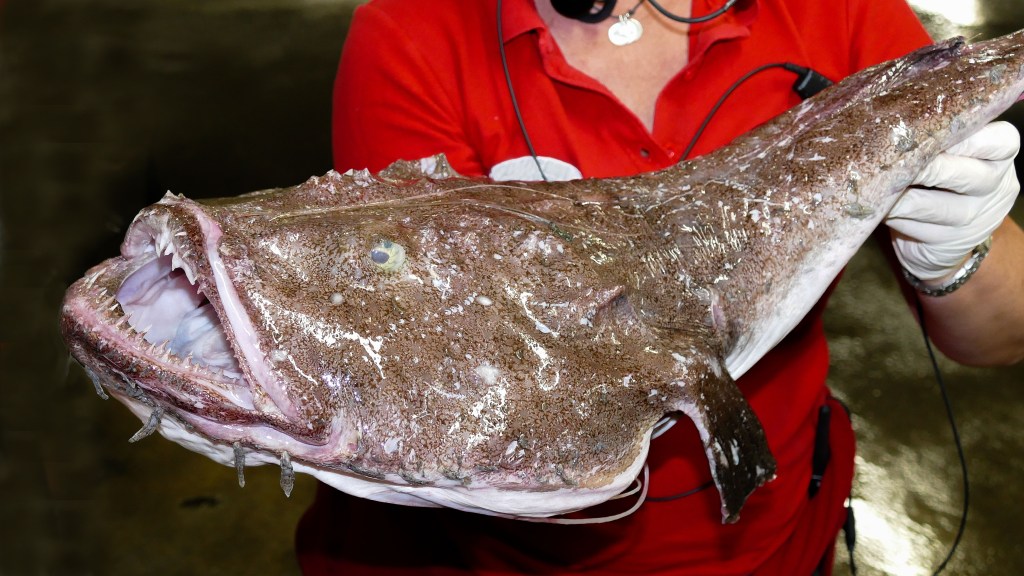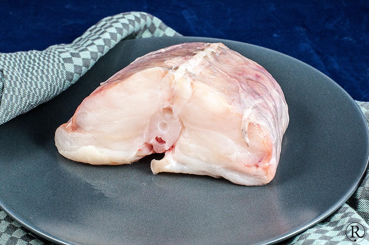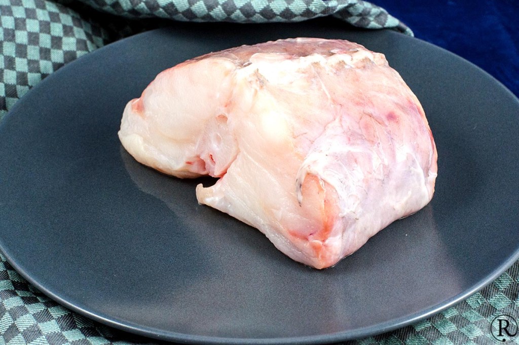 Hinter dem riesigen Kopf mit den Monsterzähnen ist der Schwanz. Ein Fisch ohne Gräten. Nur die Mittelgräte, eigentlich ein Knorpel. Dadurch sehr gut für Kinder geeignet, hinzu kommt zartes Flesch mit vorzüglichem Geschmack. Schmeckt eher wie Languste, als nach Fisch.