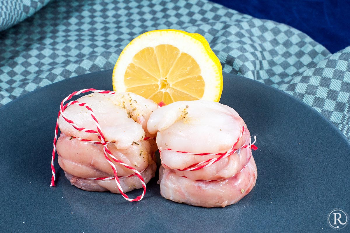 Das andere Stück zweiteilen, innen etwas pfeffern und mit einer halben Scheibe Serrano-Schinken belegen. Aufrollen. Binden. Oben und unten mit einer Scheibe Zitrone belegen. Im Kühlschrank abgedeckt frischhalten.