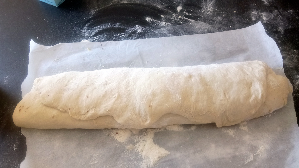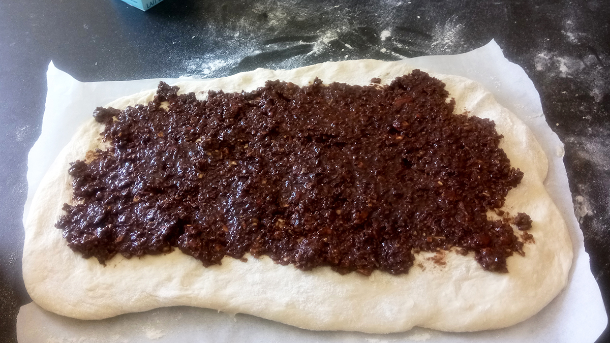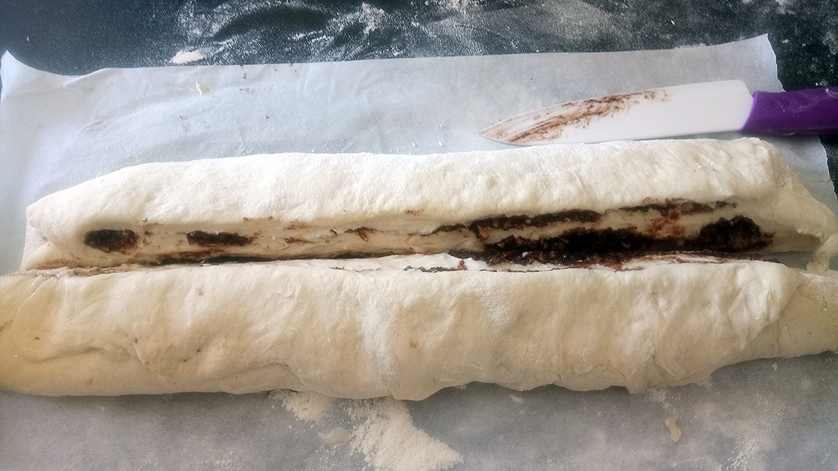 - Den Teig auf einer bemehlten Fläche zu einem Rechteck ausrollen und die abgekühlte Nussmischung darauf verstreichen. Von einer Seite her zu einer festen Rolle aufrollen und auf ein gefettetes (oder mit Backpapier ausgelegtes) Backblech legen.