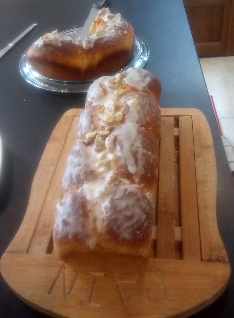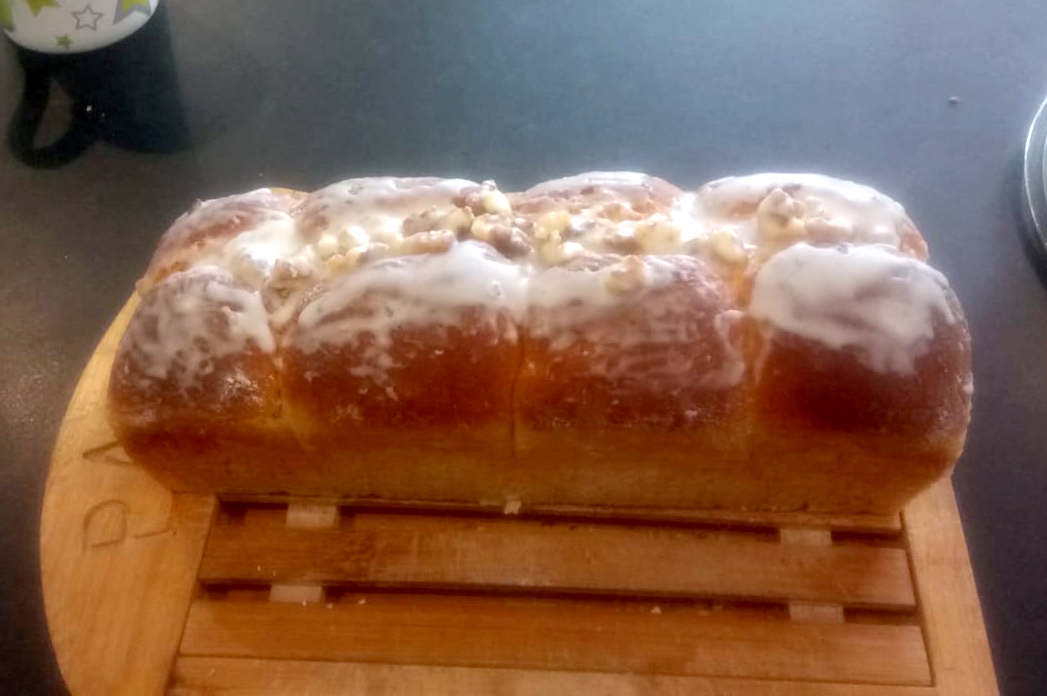 Die Glasierung auf dem noch lauwarmen Brioche verteilen und die Walnüsse darauf anrichten.