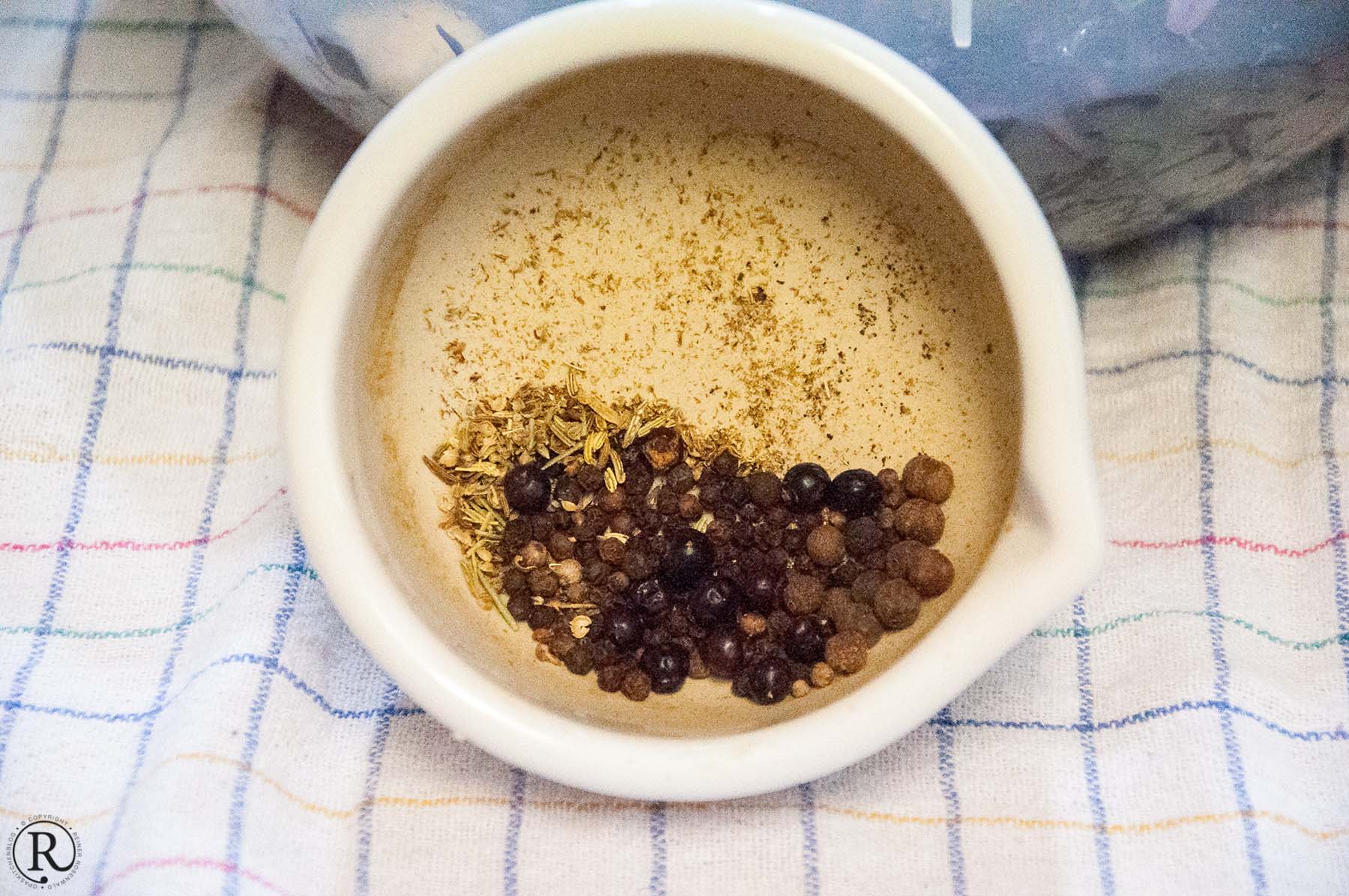 - ein paar Wachholderbeeren, einige Pimentkörner, ein oder zwei Nelken und ein paar Pfefferkörner. Die werden im Mörser angestoßen (also nicht zerrieben)