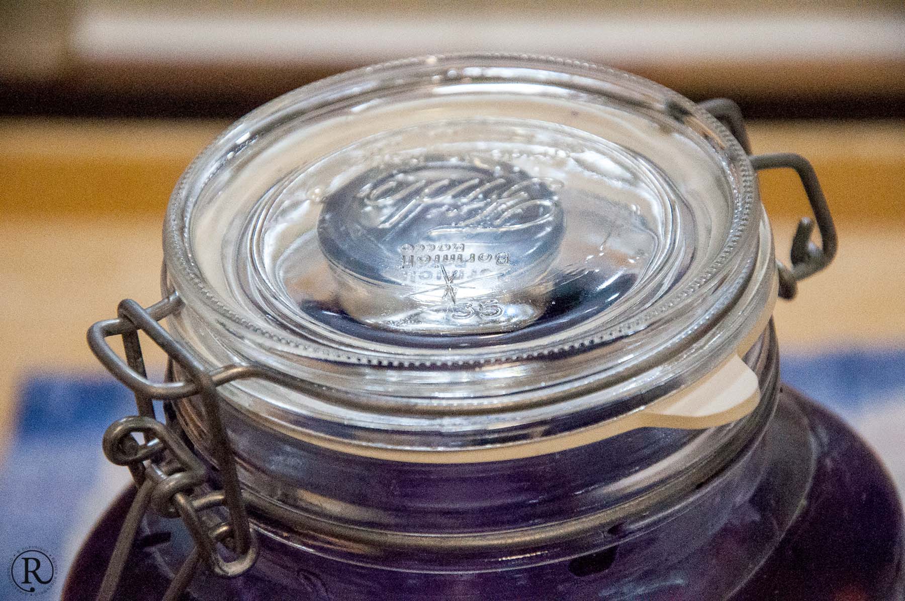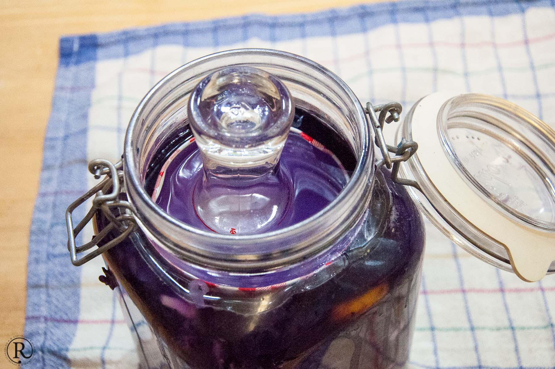 - danach das Kraut in das 2-Liter-Bügelglas stampfen, mit einem oder zwei Blätter abdecken und unter die Lake drücken. Ein Schraubdeckel von einem Marmeladenglas und ein kleines Schnapsglas halten alles zusammen mit dem Bügelverschluß unter der Lake.