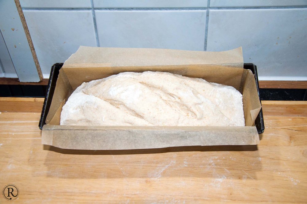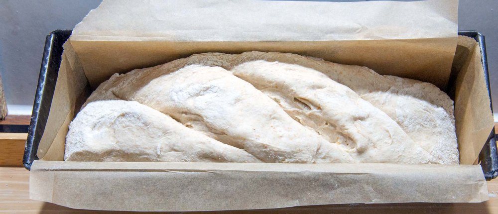 ‚Schere schneid‘ Papier!‘ - Nach der Stunde Gehzeit (es war dann doch mindestens ein viertel Stunde mehr) kommt der Teig in die vorbereitete Backform. Einschneiden und mindestens 30 Minuten, mit einem leicht feuchten Tuch abgedeckt, ruhen lassen.