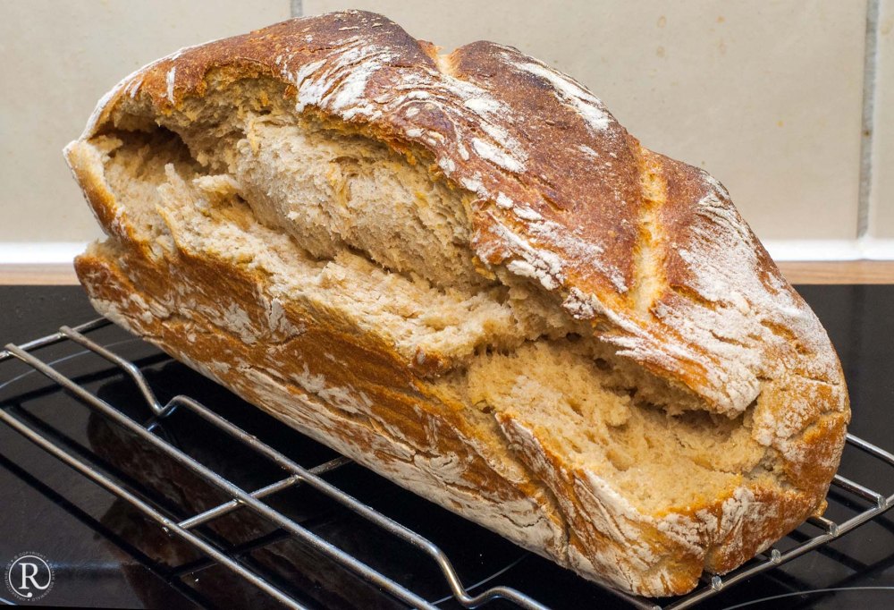 Gewohnheitsmässig habe ich die Einschnitte schräg und ich dachte auch ausreichend tief gemacht. Das war Blödsinn. Es wäre besser und richtig gewesen einen tiefen Schnitt der Länge nach zu machen. So ist das Brot seitlich aufgeplatzt.