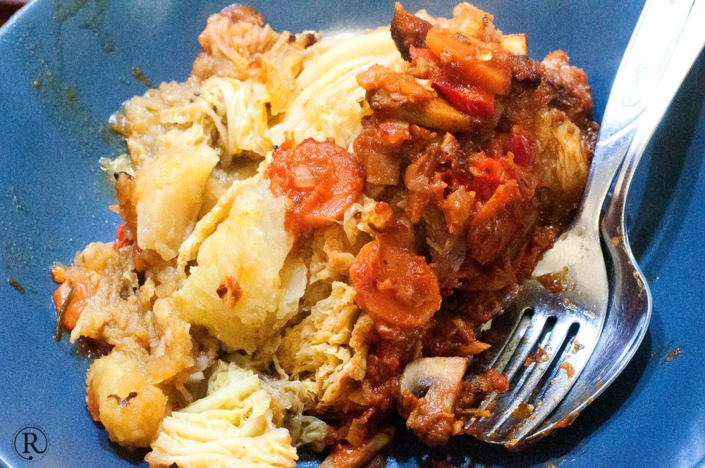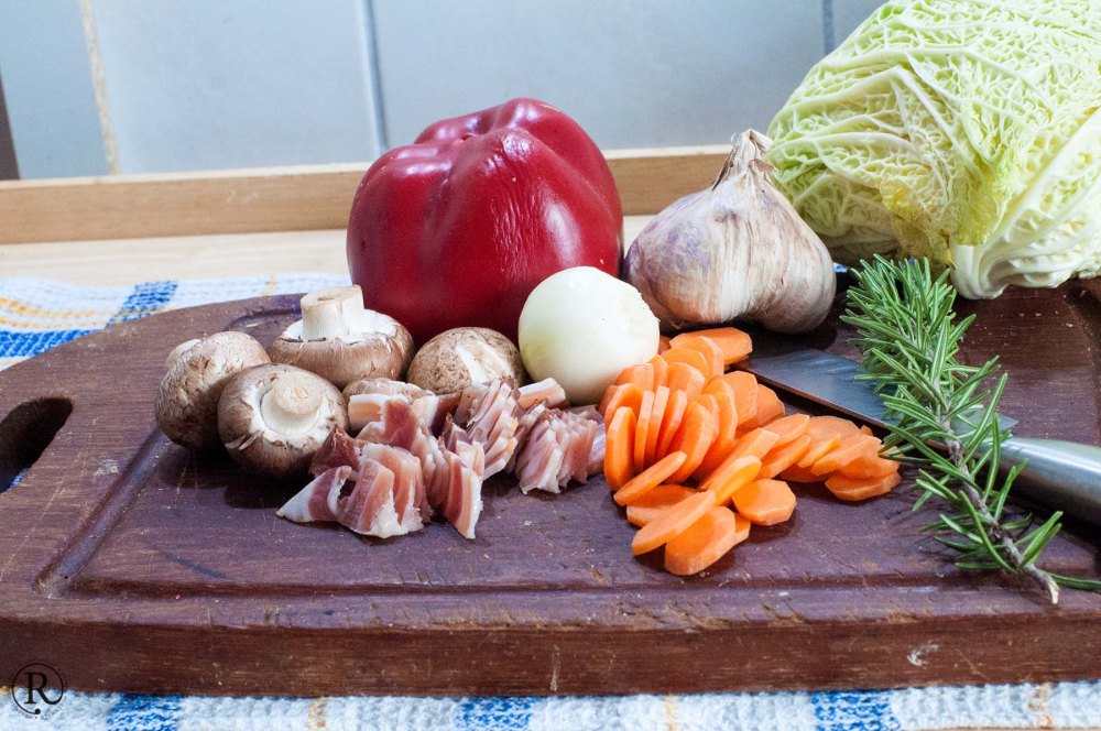 Ein Viertel ist eine reichliche Mahlzeit. Saftig und würzig, der Kohl verträgt sich gut mit dem anderen Gemüse.