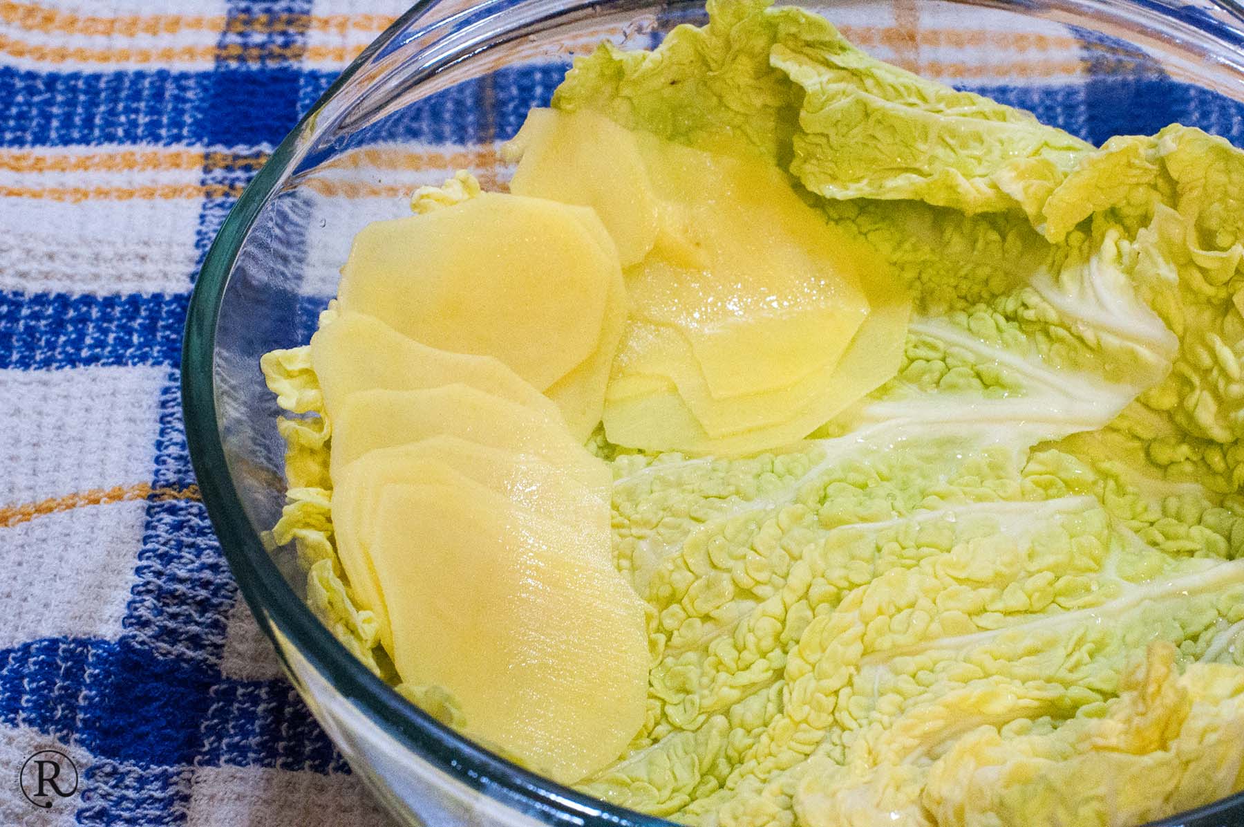 - drei oder vier größere festkochende Kartoffel, in grobe Scheiben gehobelt