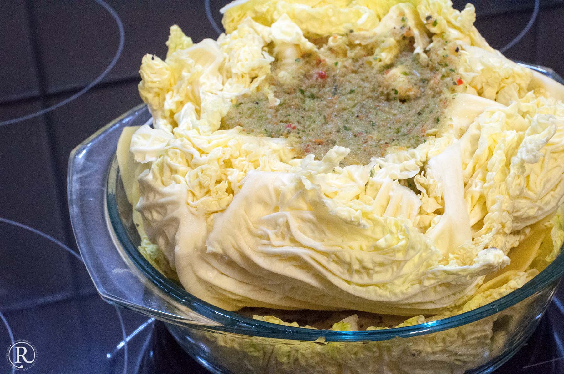 - darauf kommt der Kohl mit der Öffnung nach oben. Den Kopf platt drücken, um die Zwischenräume zu öffnen. Da kommt die Füllung hinein.