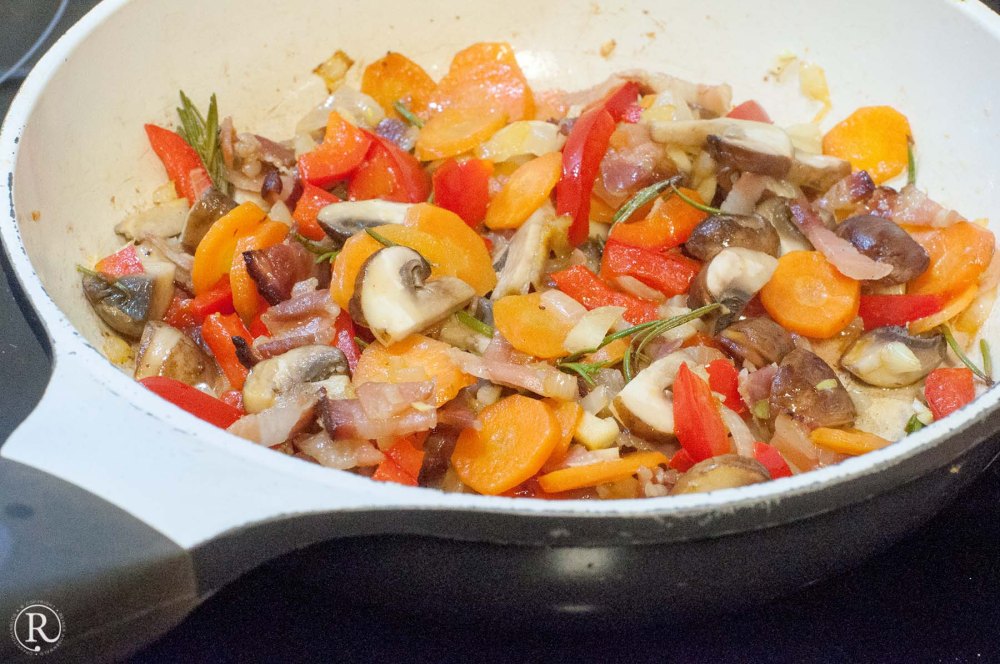 - Ist alles gut verteilt, fehlt noch Flüssigkeit. Hier kommt der Rest der Gemüsebrühe zu Einsatz.