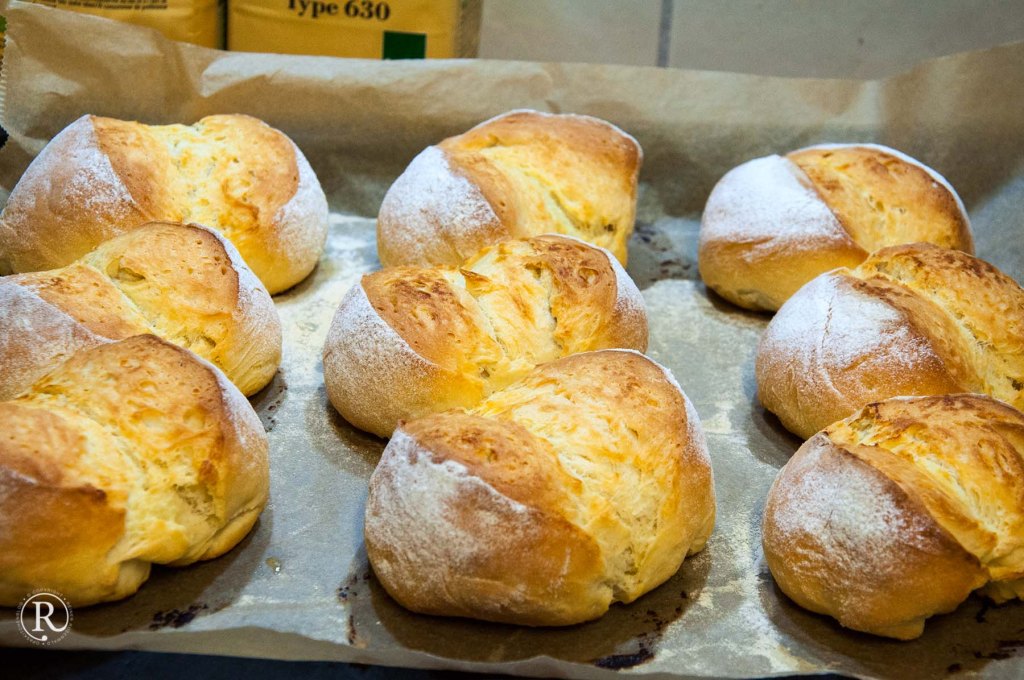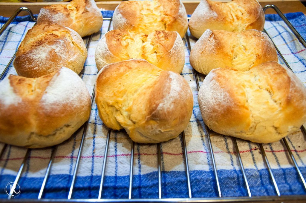 - 9 möglichst gleich große Teile abstechen und Brötchen daraus rollen