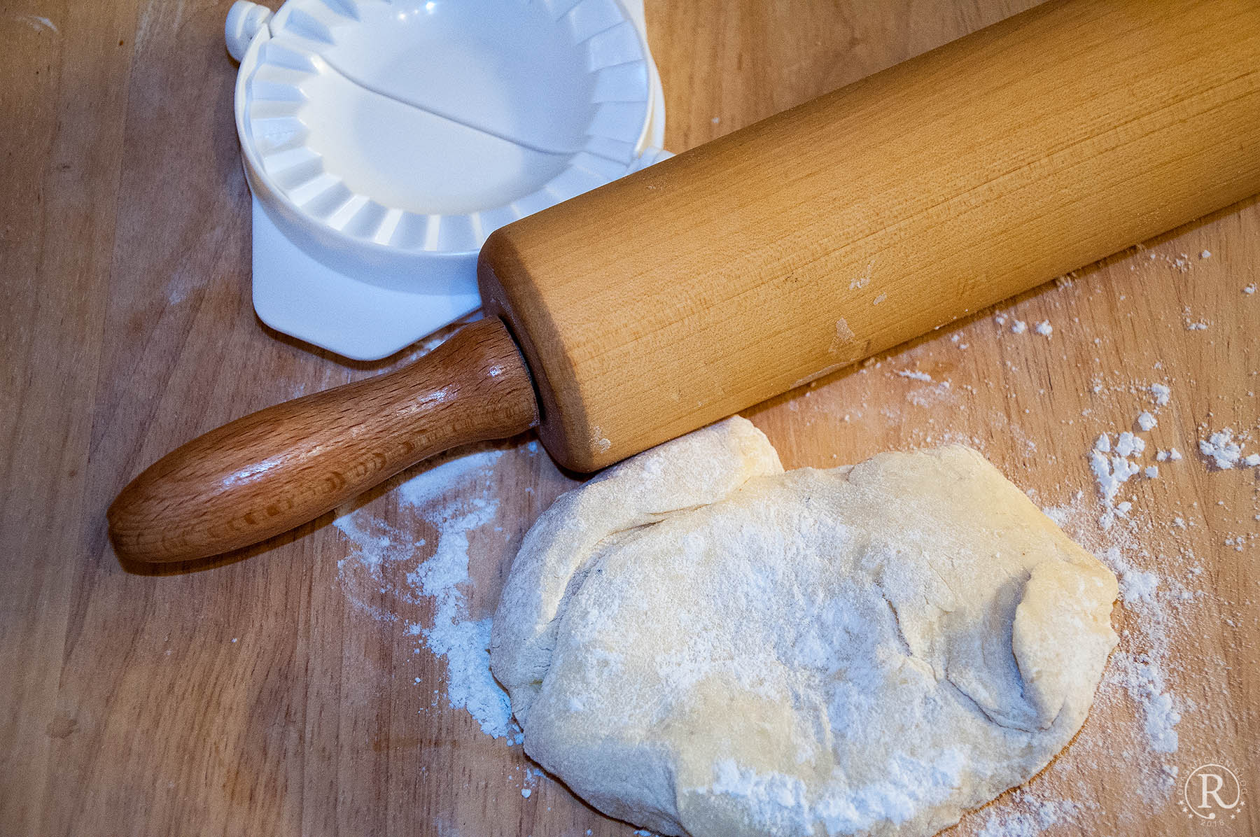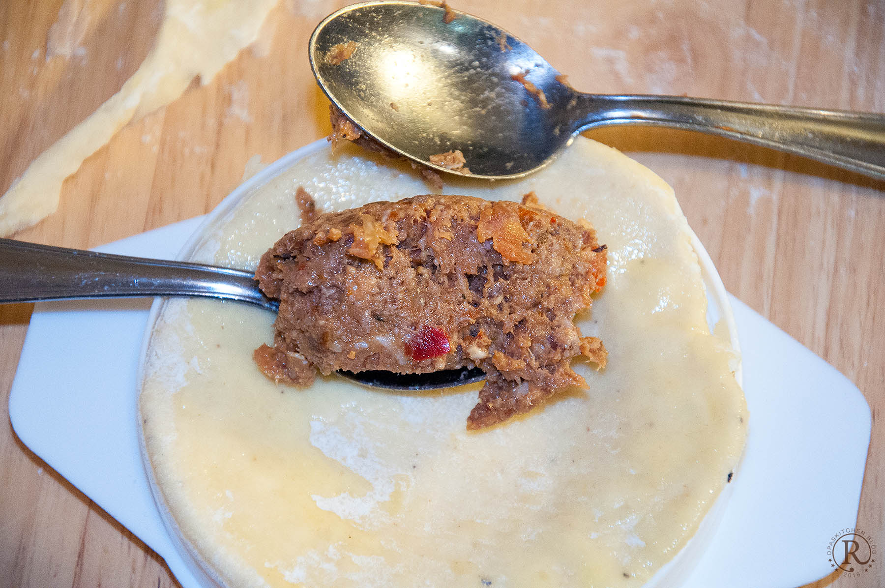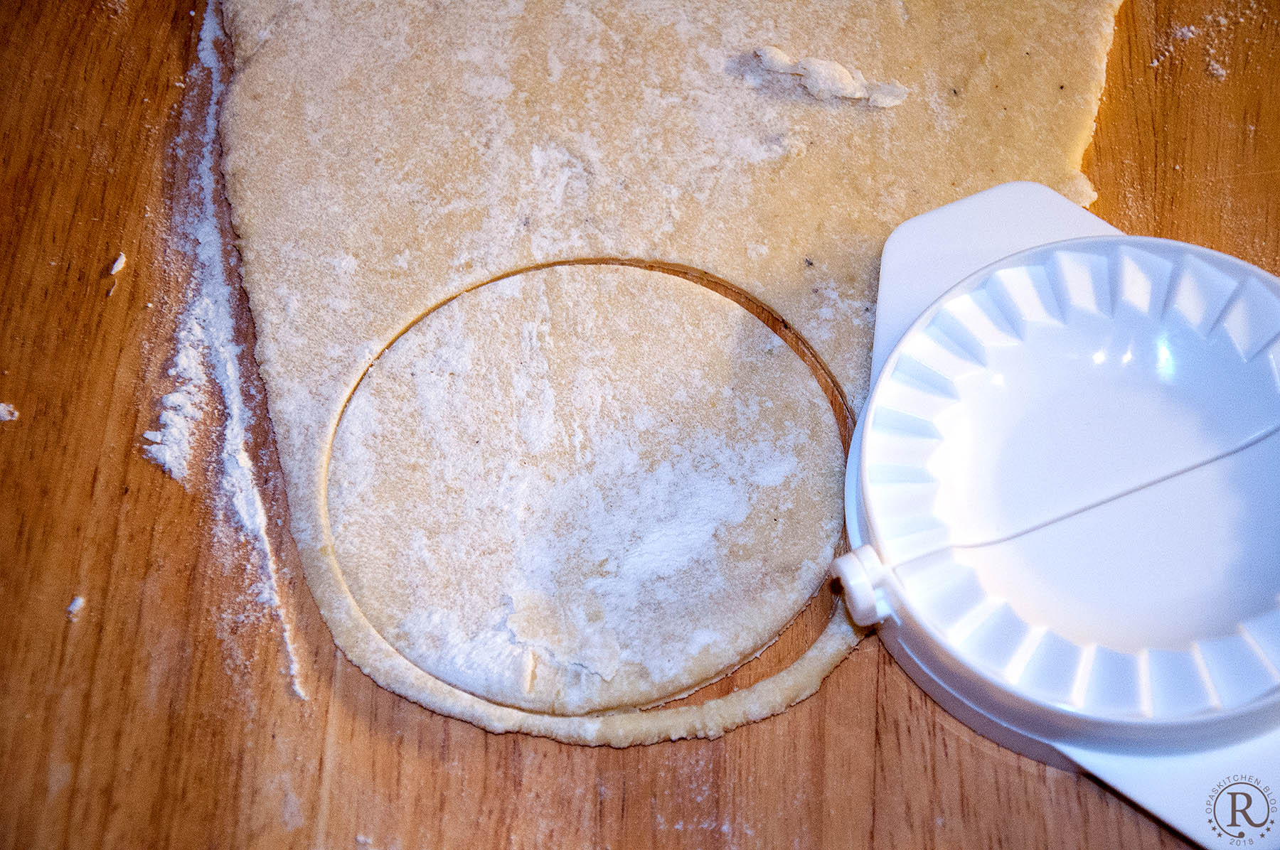 Ich mache das meist mit meiner kleinen Nudelmaschine. Der Teigstreifen hat dann auch schon die richtige Breite zum Ausstechen von etwa 10 cm großen Teigkreisen. - Ich habe mir dazu extra Förmchen gekauft, die gibt es in verschiedenen Größen.