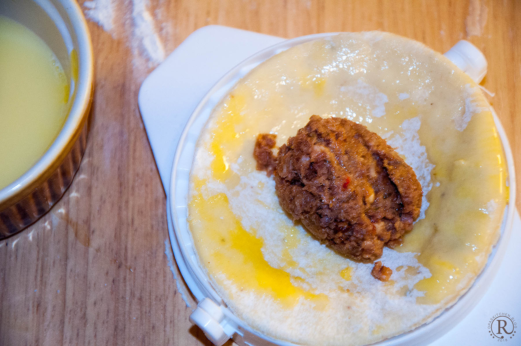 - ein Eigelb (das Eiweiß mit etwas Wasser vermischt, wird zum Verkleben der Empanadas gebraucht)