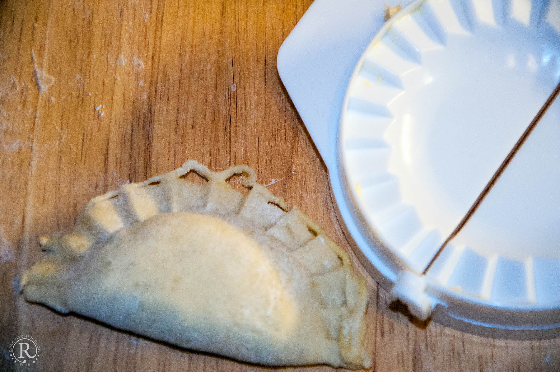 - Auf eine Teighälfte legen. Den Rand mit der Eiweiß-Wasser-Mischung bestreichen und zu klappen.