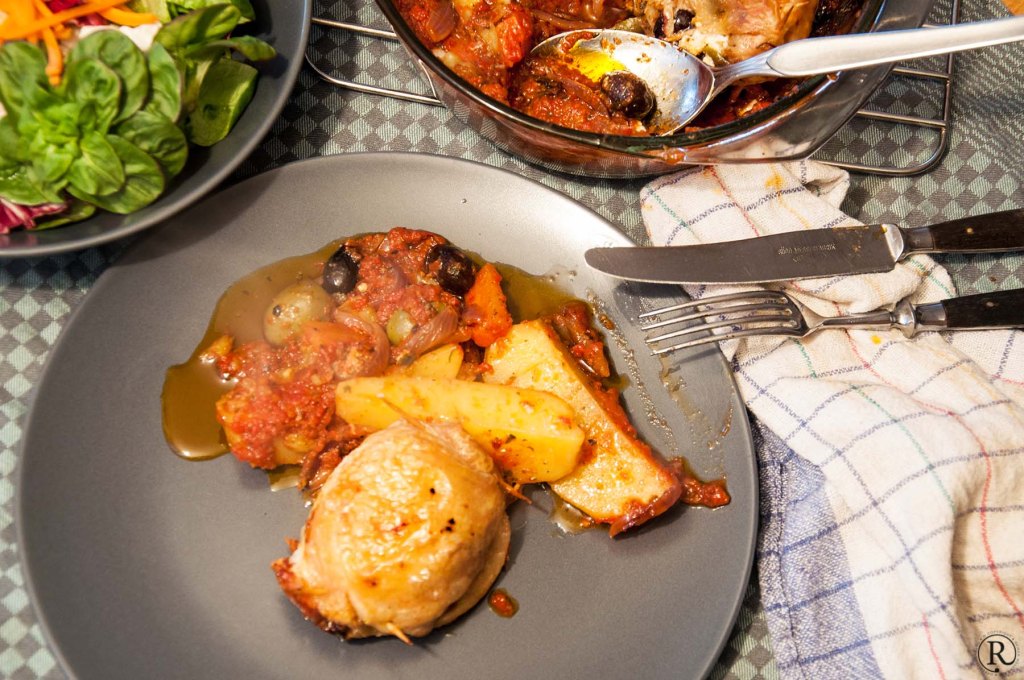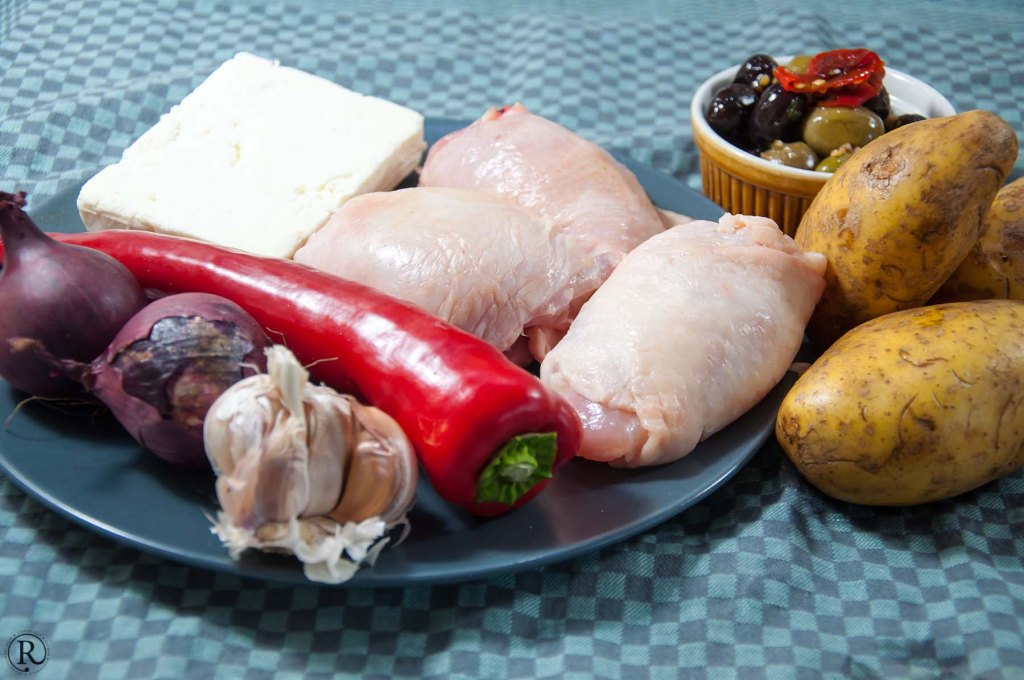 Pollo Fino ausgebeinte Hühneroberschenkel, Zutaten Feta, Paprika, Kartoffeln, rote Zwiebel, Oliven, Tomaten