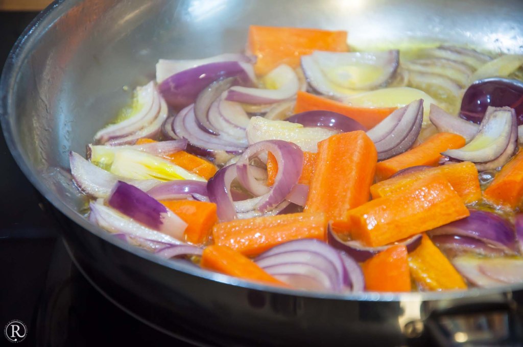 Abkühlen lassen, schälen und vierteln. In einer Auflaufform verteilen. - die Karotte in mundgerechte Stücke schneiden, in reichlich Olivenöl anbraten.