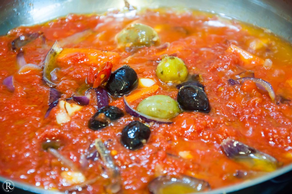 Zwiebel halbieren, in Schnitze oder Ringe schneiden, zusammen mit dem grob gehackten Knoblauch in der gleichen Pfanne anschwitzen. - Die Dose stückige Tomaten dazu.