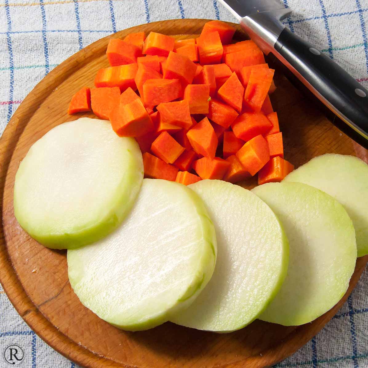 - die geschälte und gewürfelte Karotte in Olivenöl andünsten