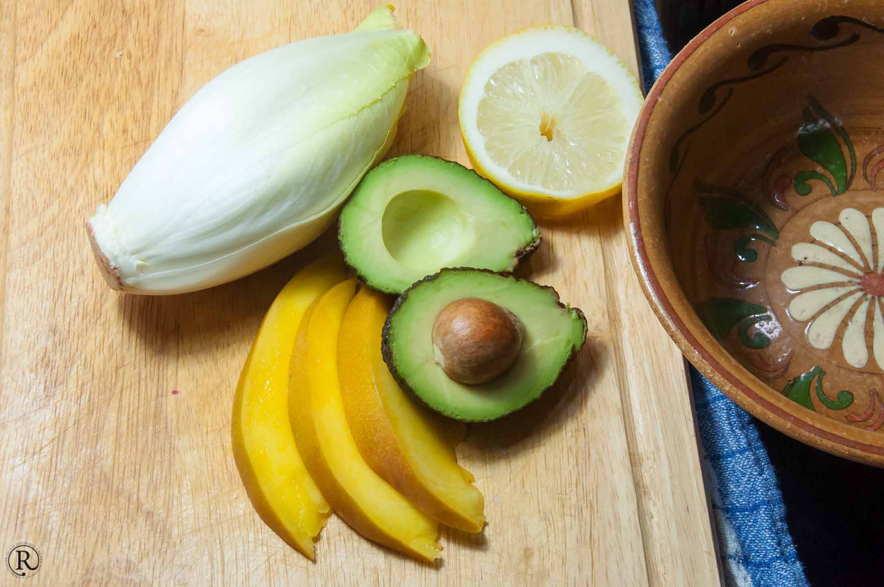 Chicoree-Avocado-Mango-Salat mit Zitronen-Olivenöl-Dressing