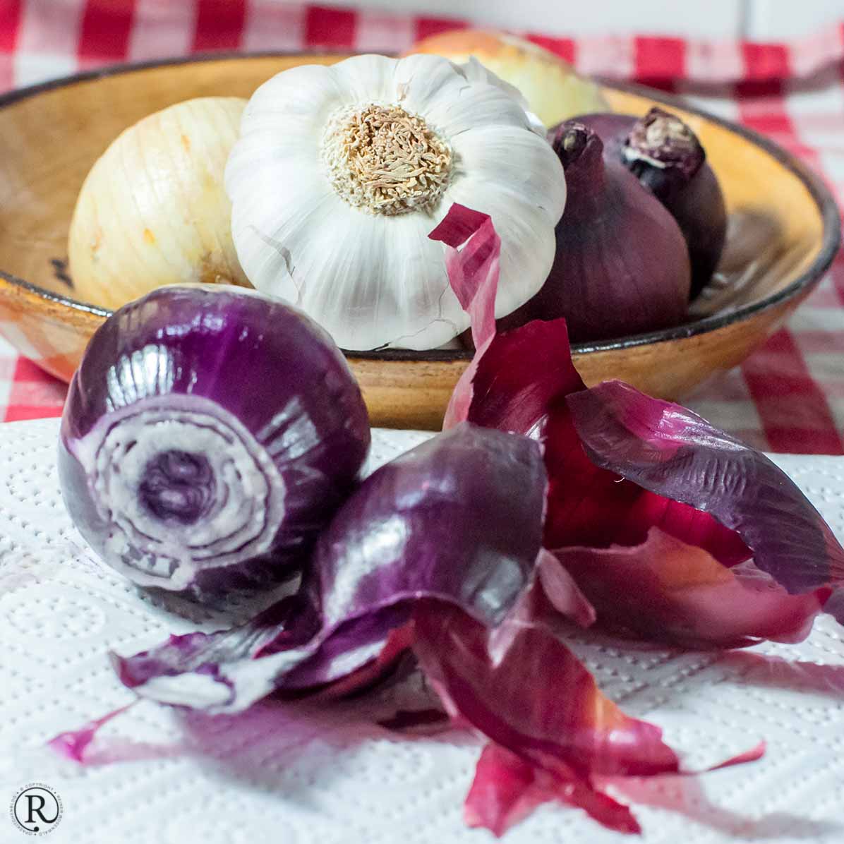 Rote und weiße Zwiebeln habe ich immer ausreichend im Haus, genauso wie Knoblauch.