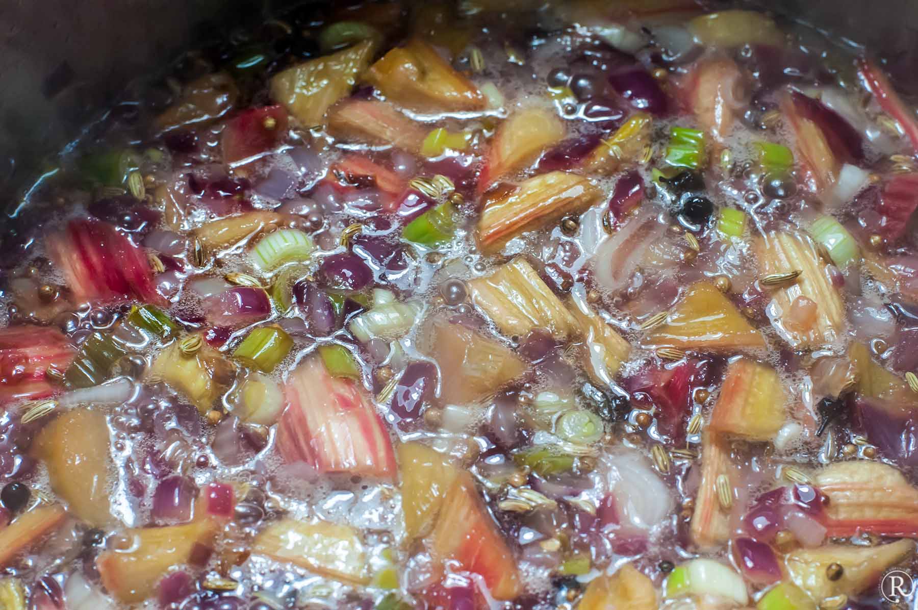 - den Rhabarber dazu und 20 bis 30 Minuten auf kleiner Flamme unter ständigem Rühren zu einer marmeladenartigen Konsistenz einkochen