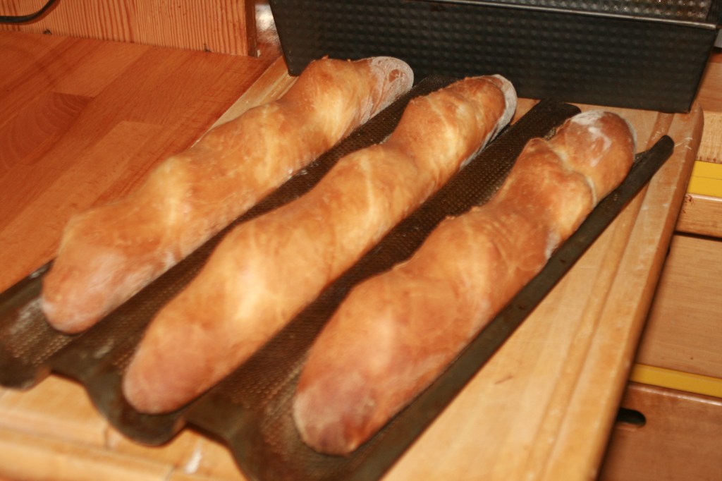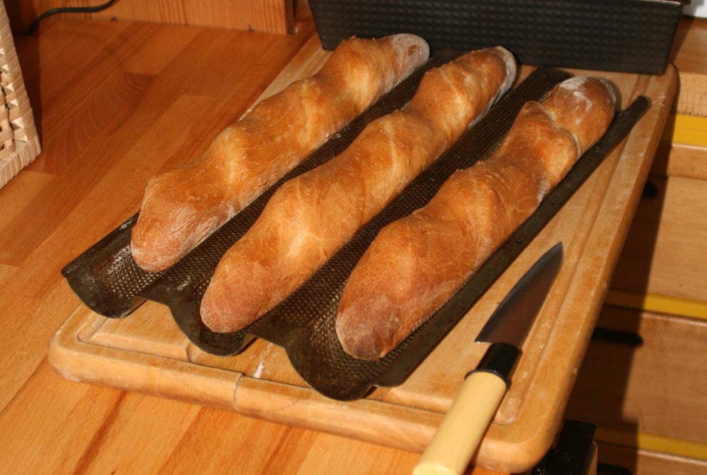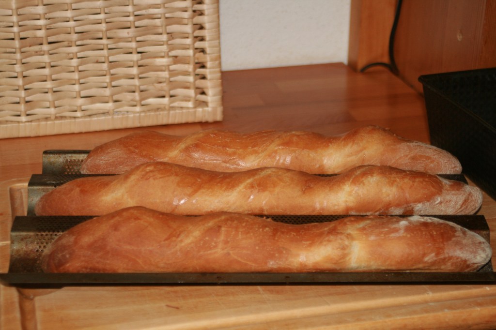 Die Backzeit verkürzt sich beim Baguette auf 25 Minuten, bei den Brötchen auf 15 bis 20 Minuten, je nachdem wie kross man sie haben möchte.