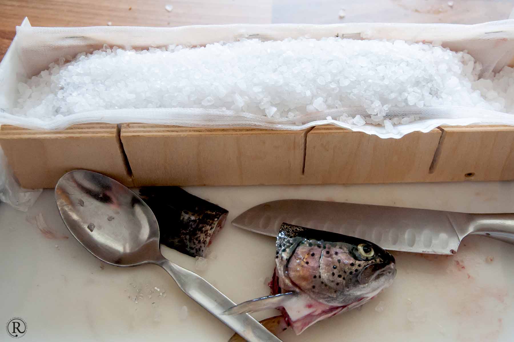 - Vider soigneusement les truites (enlever le noir), couper la tête et la queue, remplir les truites de gros sel et les poser dans la cagette. Les recouvrir de gros sel.