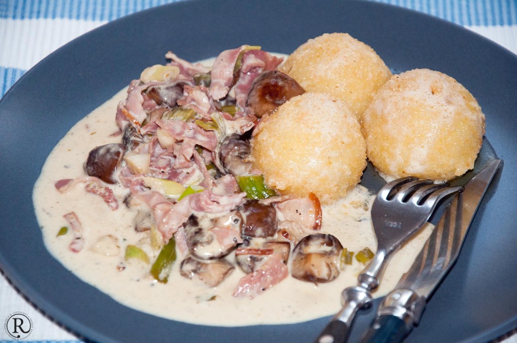 - die Klösse kann man vorab schon mal in der gewünschten Größe rollen – im Kühlschrank frisch halten
