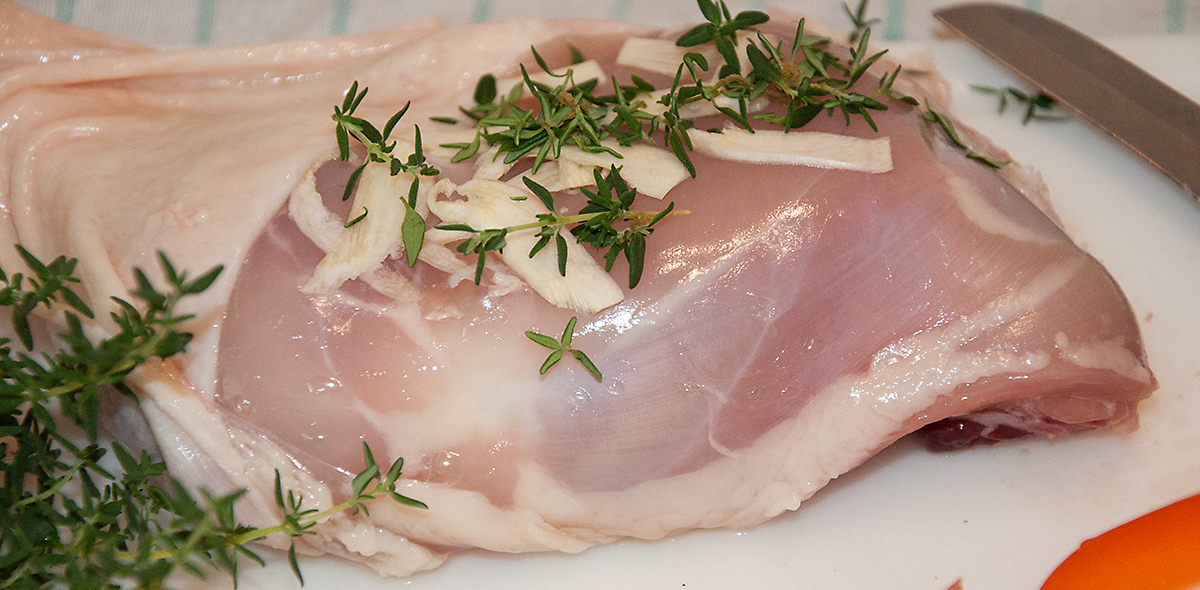 - Den Schlegel leicht salzen und pfeffern, dann das Thymian-/Knoblauchgemisch auf einer Seite auftragen (reichlich). Die Haut drüber ziehen und mit einem Zahnstocher befestigen.