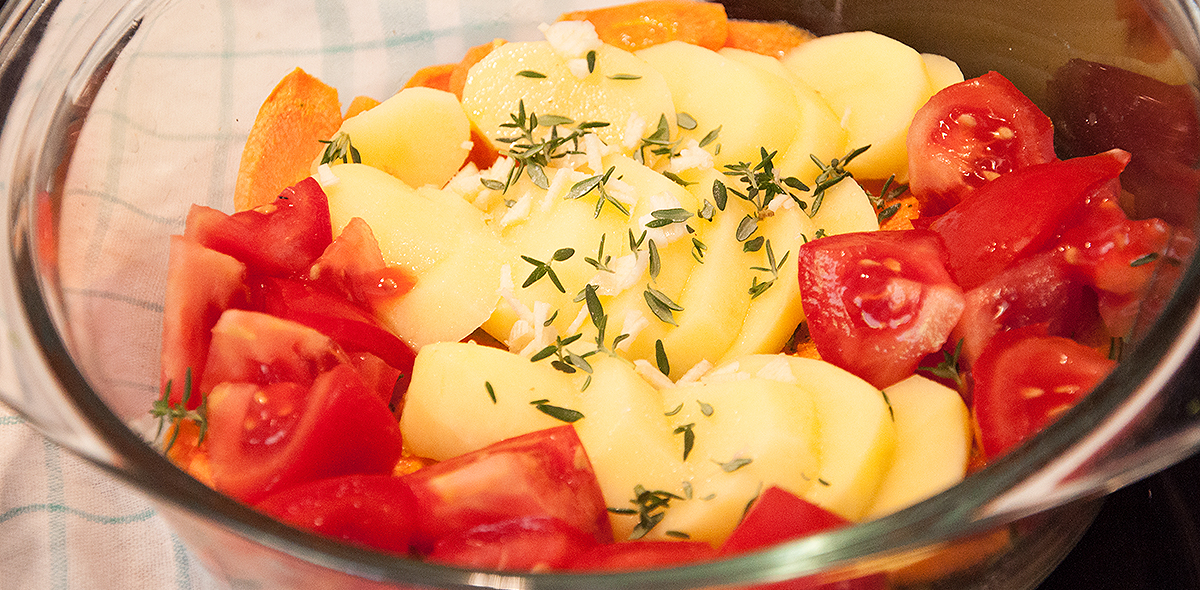 - Alles mit etwas Thymian und Knoblauch bestreuen und mit Olivenöl beträufeln. Einen Teil des Zitronenabriebs dazugeben.