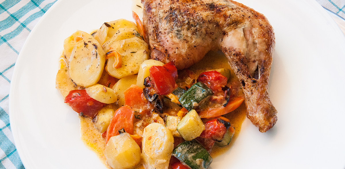 - Mit der Oberseite nach unten auf das Gemüse legen und den Backofen wieder auf 220°C bringen.