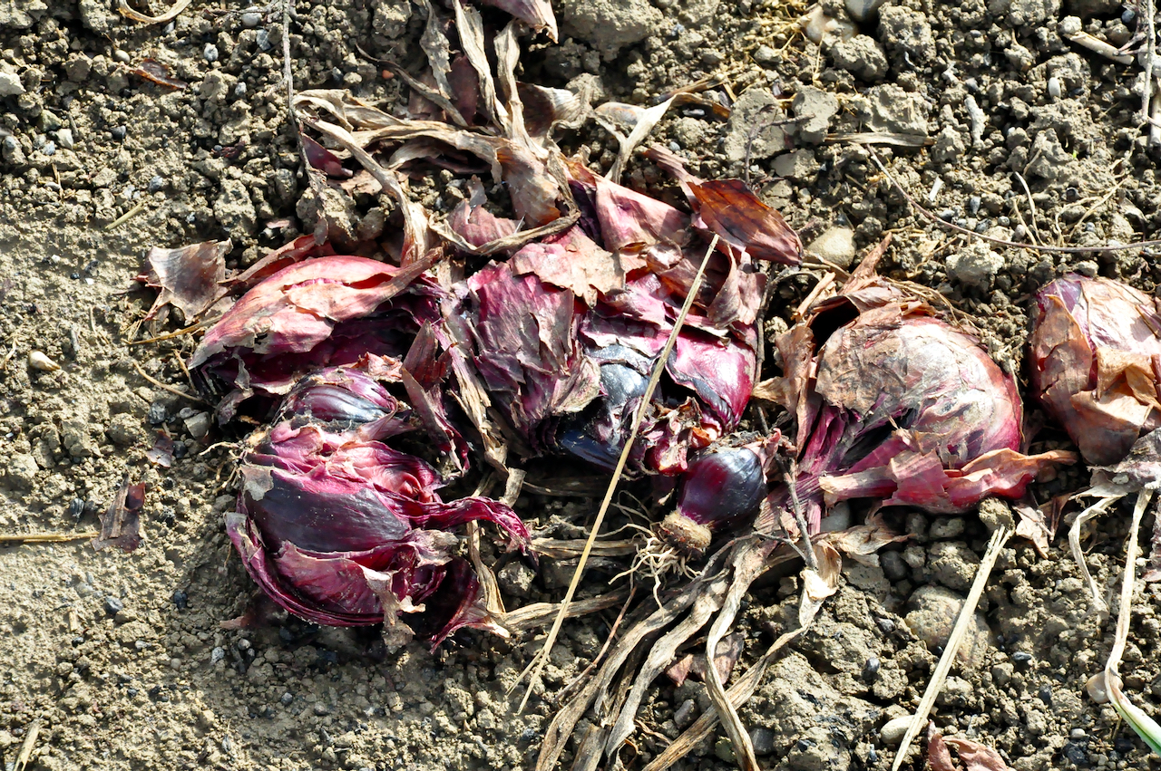 Das sind von der Ernte zurück gebliebene Zwiebel. Von der Erntemaschine aussortiert, weil zu groß oder viel zu klein, eben nicht in der Norm. Maschinen kennen keine Gnade. Was nicht ins Raster passt, fliegt raus.