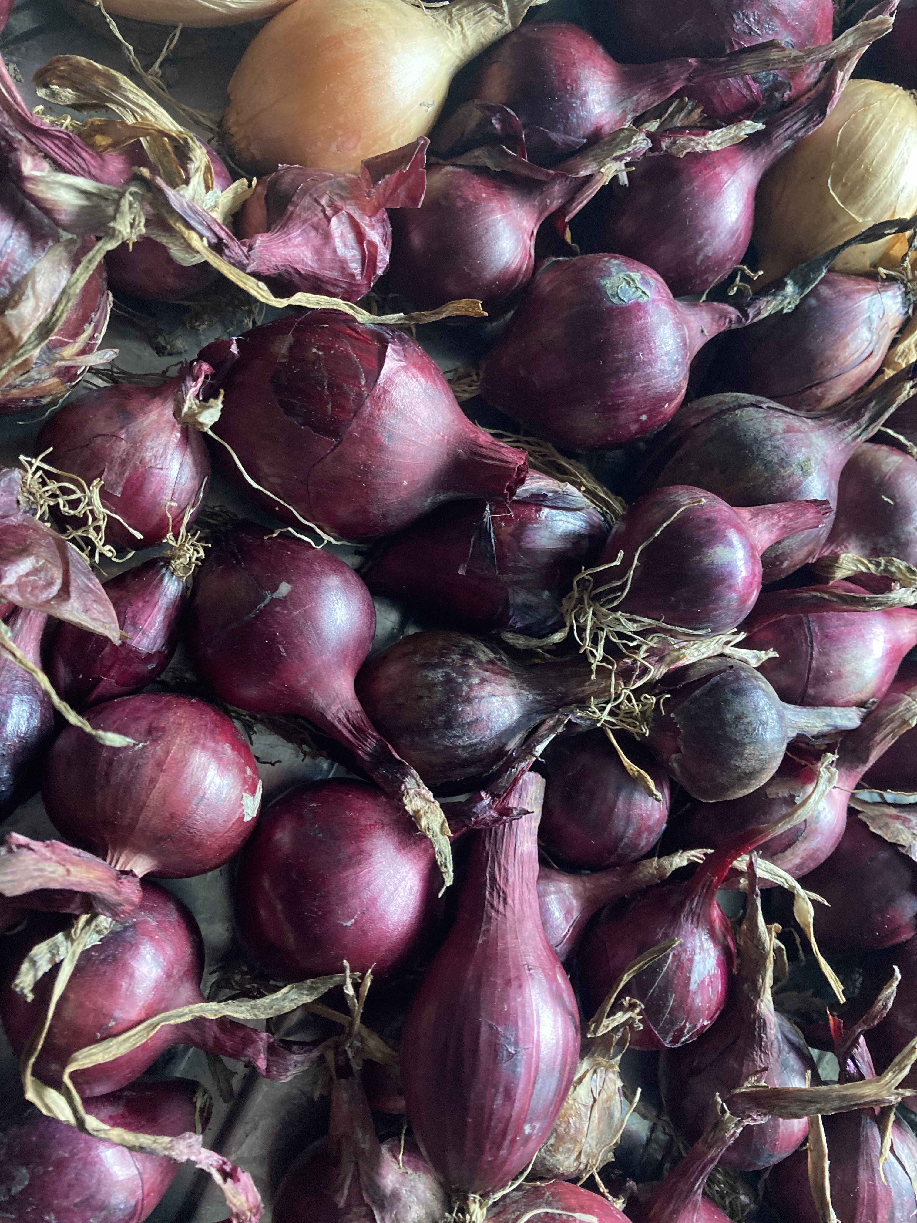 Okay, noch ein wenig Smalltalk. Der Bauer an die Arbeit, ich ans Sammeln und hier das Ergebnis: ein Säckchen mit fast 3 Kilo roter Mini-Zwiebeln in einer knappen halben Stunde!