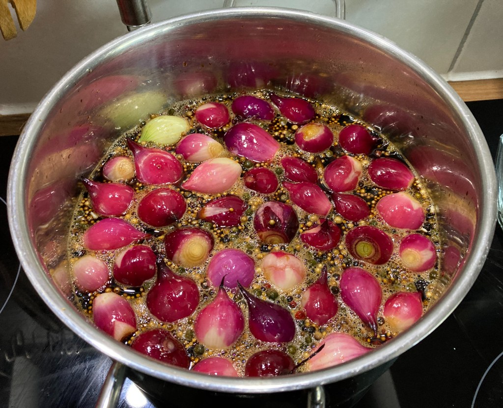 - jetzt die Zwiebel in den kochenden Sud, kurz aufkochen und dann circa 3 bis 5 Minuten simmern lassen. Das ist abhängig von der Größe der Zwiebel – die sollten keinesfalls zu weich werden.