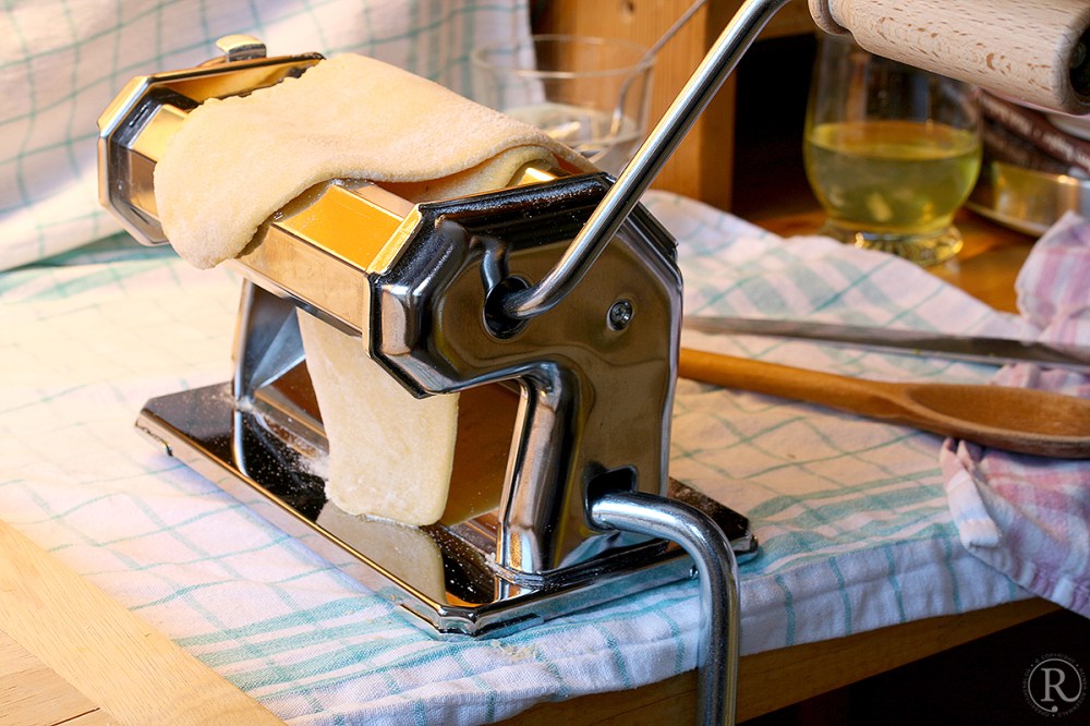Jetzt kommt die Fleißarbeit. Den kühlen Teig in etwa 150 g schwere Stücke portionieren und diese mit der Nudelmaschine, bis zur feinsten Einstellung durchwalken.