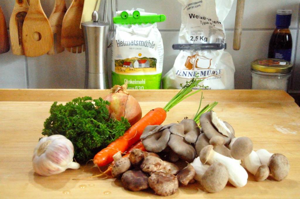 Die Pilze habe ich vom Breisacher Samstagsmarkt, da ist seit neuestem ein Stand der Bio-Pilze aus Gündlingen anbietet.
